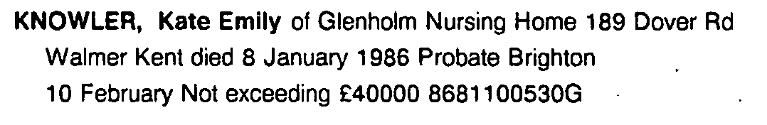 [ Home ] | [ Calendar ] | [ Surnames Index ] | [ Family History ]Kate Carlton, the wife of Thomas William Knowler (the first cousin twice-removed on the mother's side of Nigel Horne), was born on Jul 5, 18871. She married Thomas in Dover, Kent, England in 19513 (Oct/Nov/Dec). In 1986, she lived on Glenholm Nursing Home, 189 Dover Road, Walmer, Kent. That is also where she died on Jan 8, 1986 in Dover1,2.