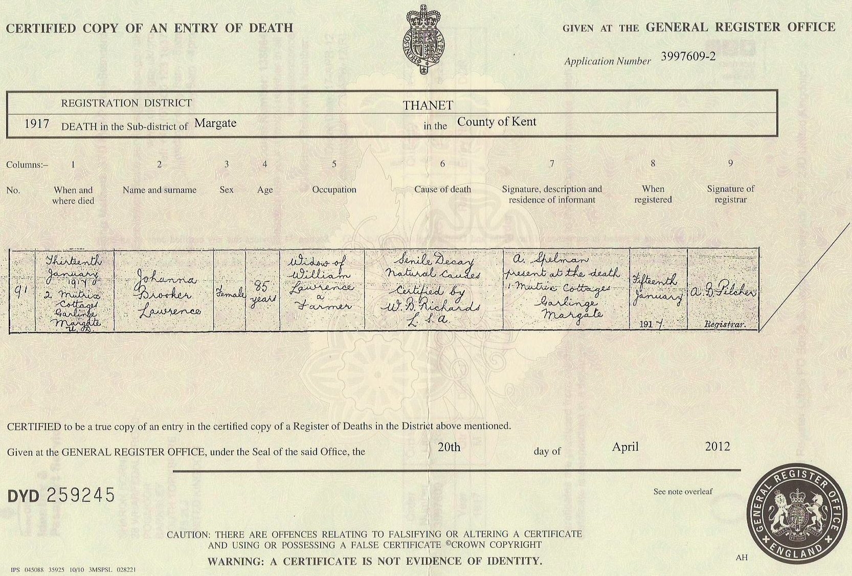She died on Jan 31, 1917 at 2 Mutrix Cottages, Garlinge, Kent8 (senile decay).