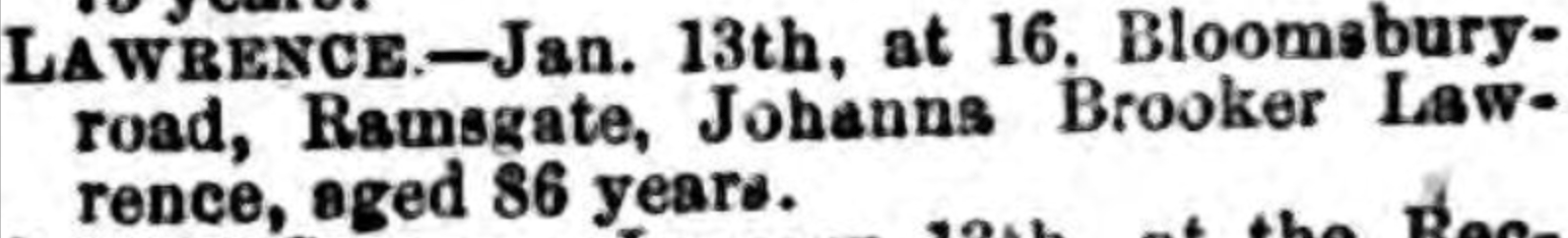 Johanna spent all of her life in Kent, England. Throughout her life, she lived in several places around the county: at her birthplace on Jun 6, 184110 and in 18512 (the same place as her parents had been living in 1841); on Chapel Lane, St Lawrence, Thanet, Kent, England on Apr 7, 186112; at Rear of Southwood Lodge, St Lawrence in Thanet on Apr 2, 187111; at 3 Providence Cottage, St Lawrence in Thanet on Apr 5, 18915; on 3 Lorne Road, St Lawrence in Thanet on Mar 31, 190113, when she was living with her daughter Elizabeth following the death of her husband on Jun 11, 1898; and on 16 Bloomsbury Road, Ramsgate on Apr 2, 191114.