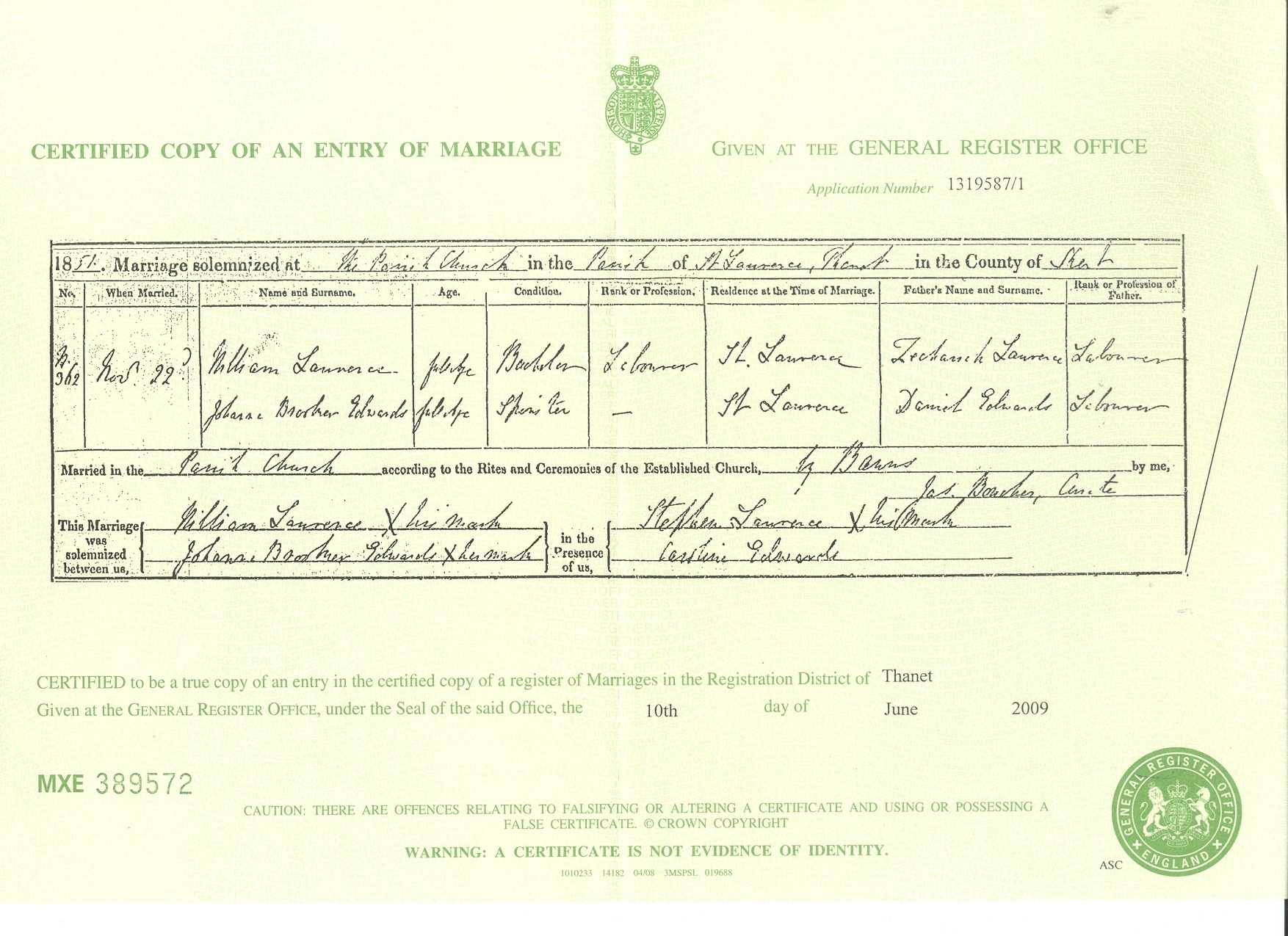 William Laurance - Johanna Brooker Edwards - marriage certificate