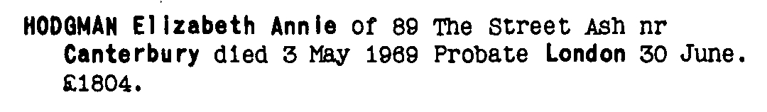 Elizabeth spent all of her life in Kent, England. Throughout her life, she lived in several places around the county: in Staple on Mar 31, 190110; at Oast Cottages, Cleve, Monkton on Apr 2, 19119; at Hoaden Cottages, Ash on Sep 29, 19392; and at 89 The Street, Ash in 1969.