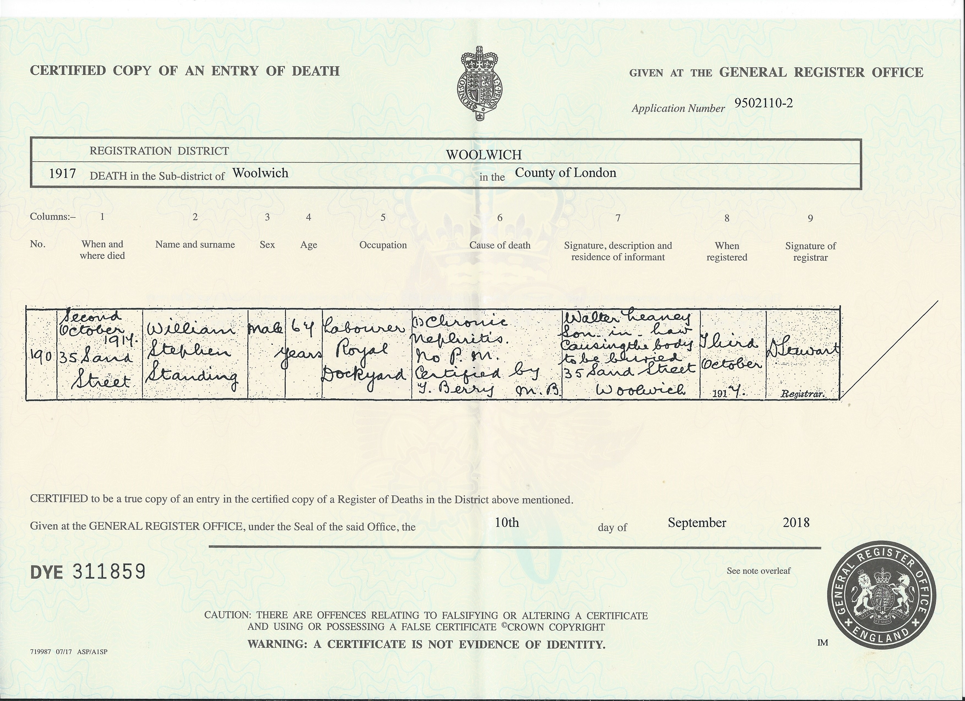 William Stephen Standing - death certificate