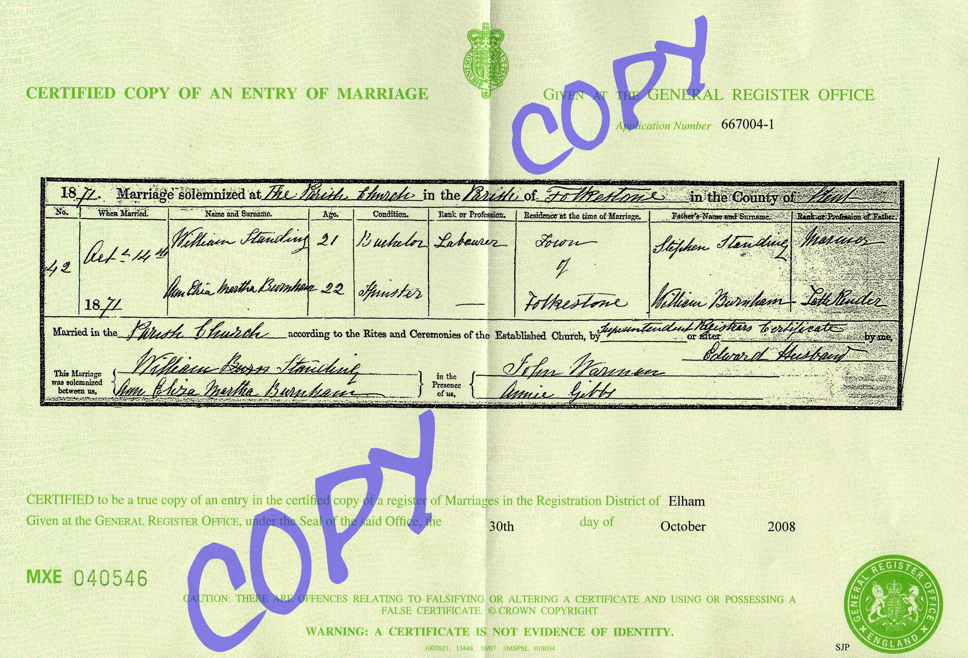 William Standing, the second cousin three-times-removed on the father's side of Nigel Horne, was born in Folkestone, Kent, England in 18501,2,3,4,5,6,7 and married Adeliza Burnham (with whom he had 4 children: Walter William, Jessie, William Ernest and Amy Elizabeth) at The Parish Church of St Mary and St Eanswythe, Church Street in Folkestone on Oct 14, 18718 (St. Mary).