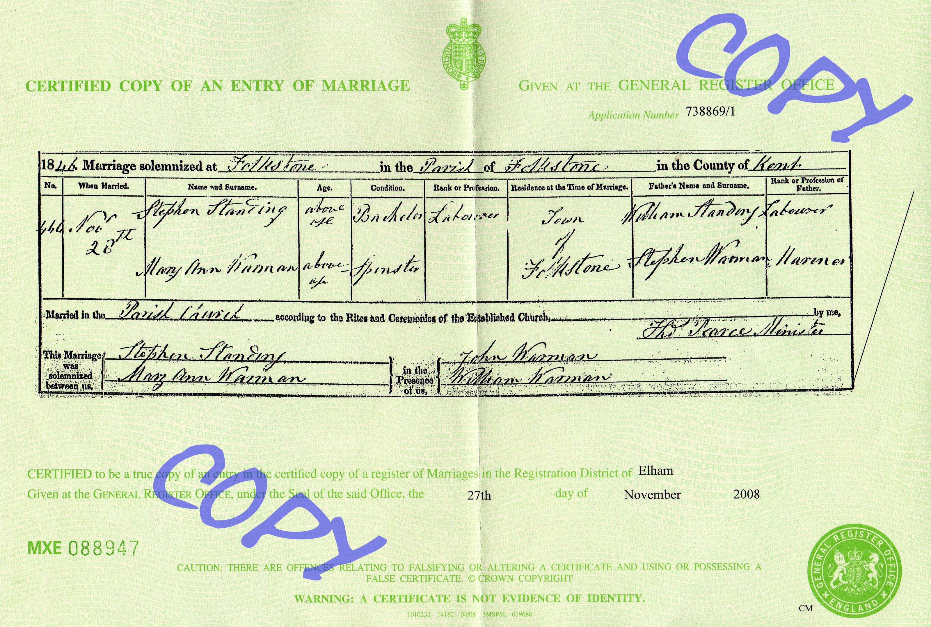 [ Home ] | [ Calendar ] | [ Surnames Index ] | [ Family History ]Mary Warman, the wife of Stephen Standing (the first cousin four-times-removed on the father's side of Nigel Horne), was born in Folkestone, Kent, England in 18281,2,3 was married twice - to Stephen Standing (on Nov 28, 1846 in Folkestone) William Standing (on Mar 1, 1865 in Folkestone)4. She had 4 children with Stephen Standing: William, Esther Hannah, William Stephen and Mary Ann.