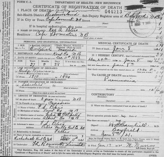 He died on Jan 8, 1921 in Westmorland, New Brunswick4 (pneumonia) and was buried in Richibucto, Kent, New Brunswick after Jan 8, 19214.