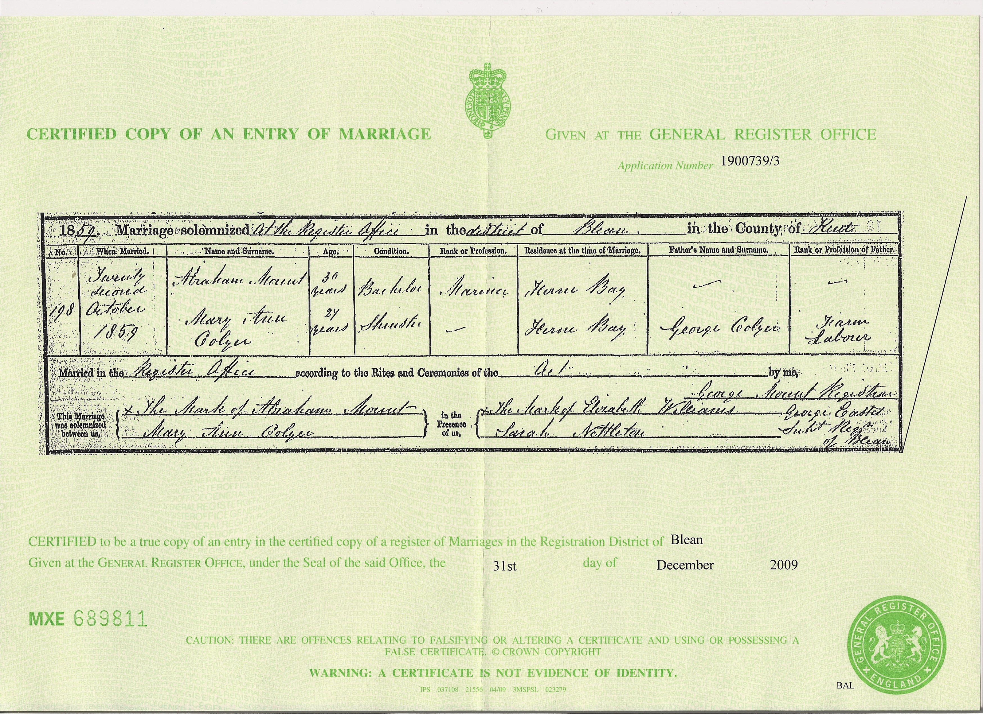 Mary Colyer, the great-great-grandmother of Nigel Horne, was born in Herne, Kent, England c. 18321,2,3,4,5,6, was baptized in Blean, Kent, England on Jul 13, 1833 and married Abraham Mount (a mariner with whom she had 5 children: William, Elizabeth Ann, Edwin Henry, Mary A and Walter Charles) in Herne Bay, Kent, England on Oct 22, 18598 (Registry office).