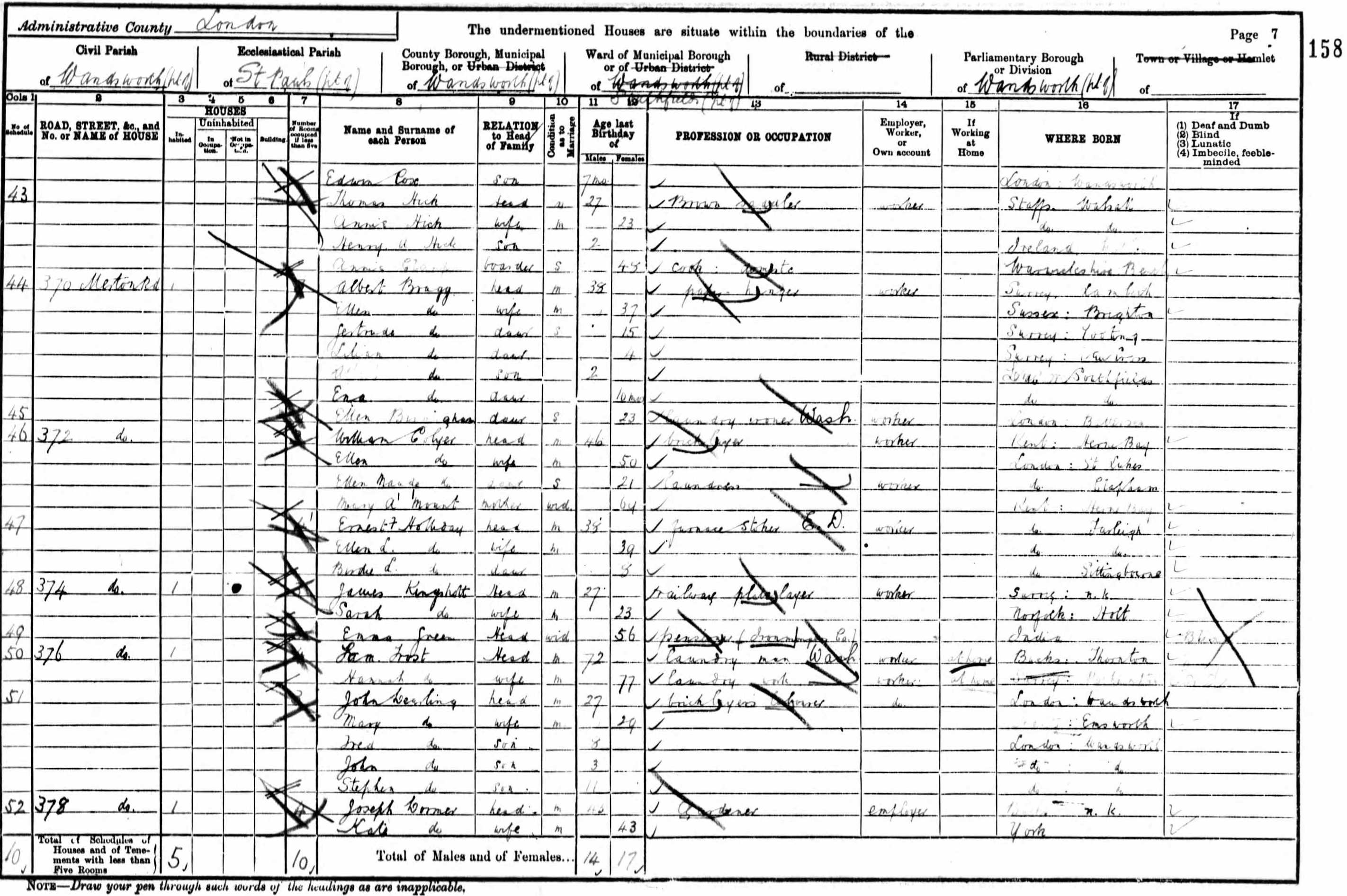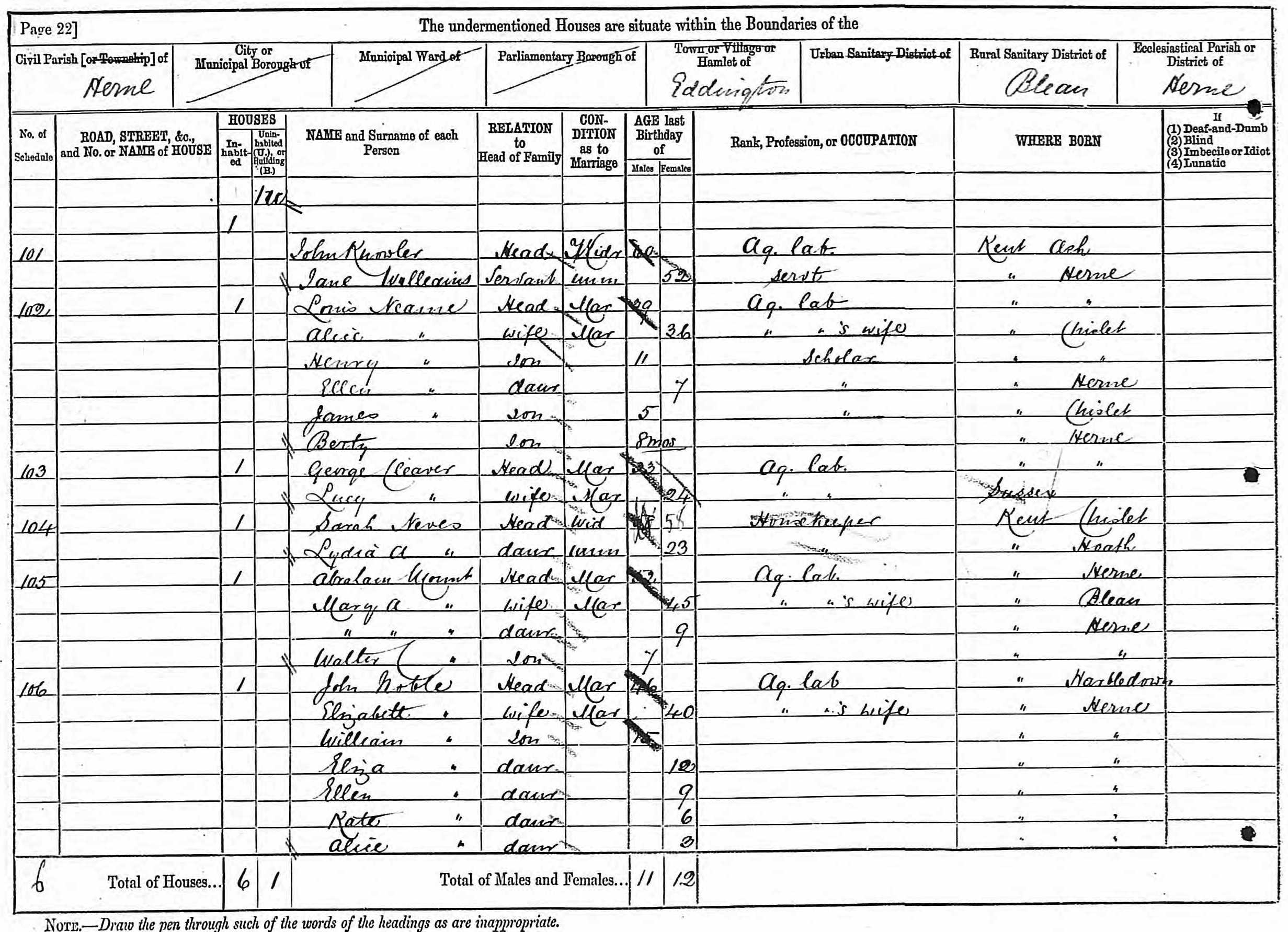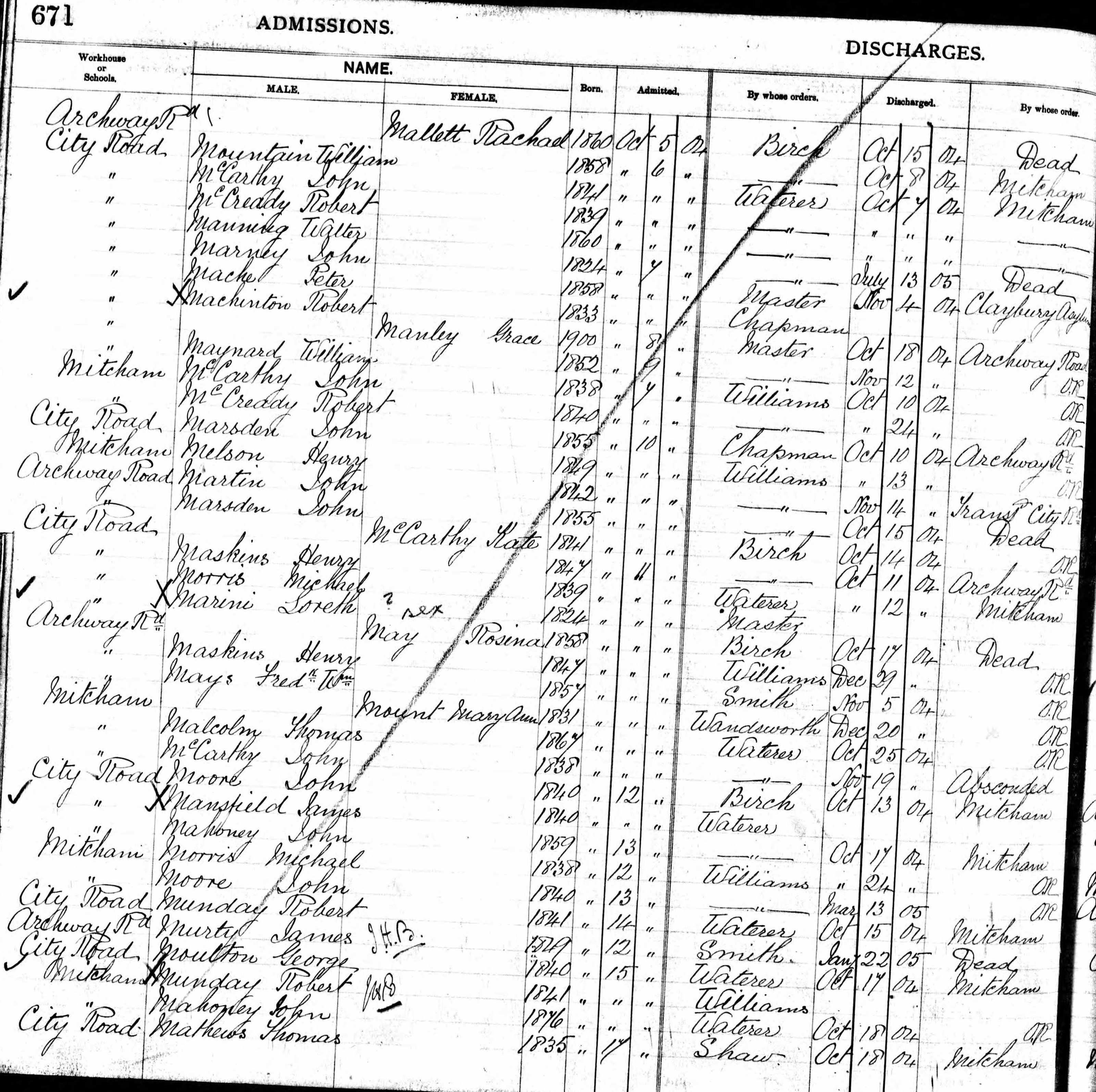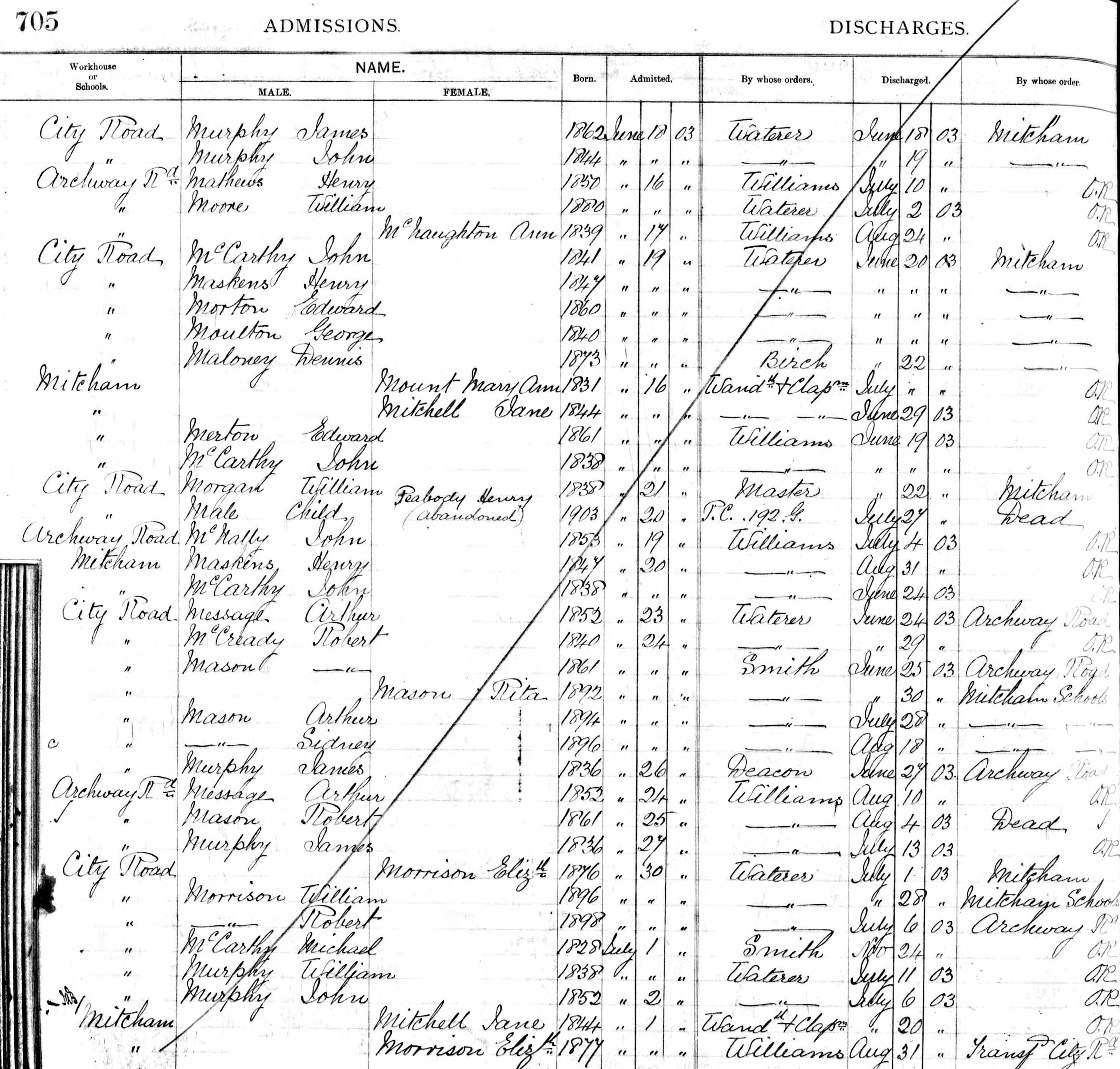Throughout her life, Mary lived in several places: on Salts Lane in Herne Bay on Apr 2, 18719; in Eddington, Kent on Apr 3, 188112; at 2 Salts Lane in Herne Bay on Apr 5, 18913; on 372 Merton Road, Wandsworth, London, England on Mar 31, 19014, when she was living with her son William, following the death of her husband on May 12, 1897; in hospital at Mitcham Workhouse, Holborn, London from Jun 16, 1903 to Jul 22, 1903; in hospital from Oct 11, 1904 to Dec 20, 1904; and in hospital on Tooting Bec Asylum, Church Lane, Tooting Common, London on Sep 7, 1906 and on Apr 2, 191110.