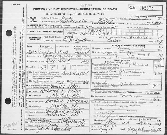 He died on May 8, 1961 at 907 Barker Street, Fredericton, York, New Brunswick4,5 (cerebral artery thrombosis) and was buried at Sunny Bank Cemetery, McEvoy Street, Fredericton after May 8, 19614,5.