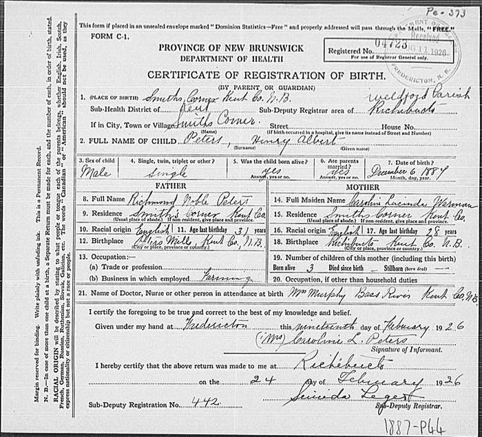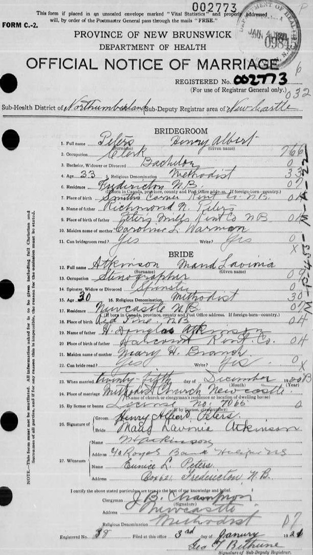 Henry Peters, the third cousin twice-removed on the father's side of Nigel Horne, was born in Smiths Corner, Kent, New Brunswick, Canada on Dec 6, 18871,2,3,4,5 and married his second cousin once-removed on his father's side Maud Atkinson (a stenographer with whom he had 1 child, Margory Elaine) at Methodist Church, Newcastle, Northumberland, New Brunswick, Canada.