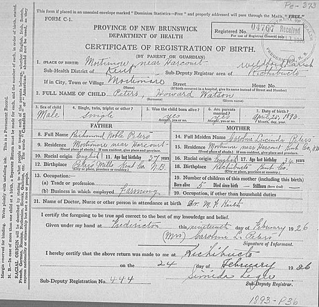 Howard Peters, the third cousin twice-removed on the father's side of Nigel Horne, was born in Harcourt, Kent, New Brunswick, Canada on Apr 25, 18931,2,3,4,5,6. He married Lila Lawson at Gibson Memorial United Church, South Devon, Fredericton, New Brunswick, Canada on Apr 23, 1930.