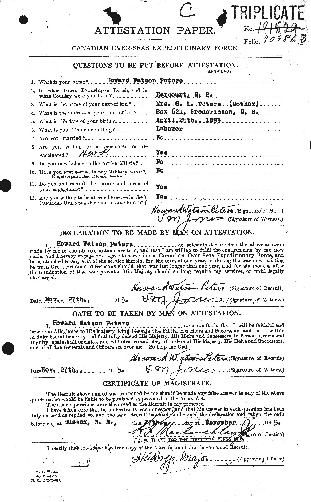 Throughout his life, Howard lived in several places: in York, New Brunswick in 19111; in Canada in 19155; and in Douglas, York, New Brunswick on Jun 1, 19212. On Nov 27, 1915 he was serving in the military in France (army; 104th Overseas Battalion).