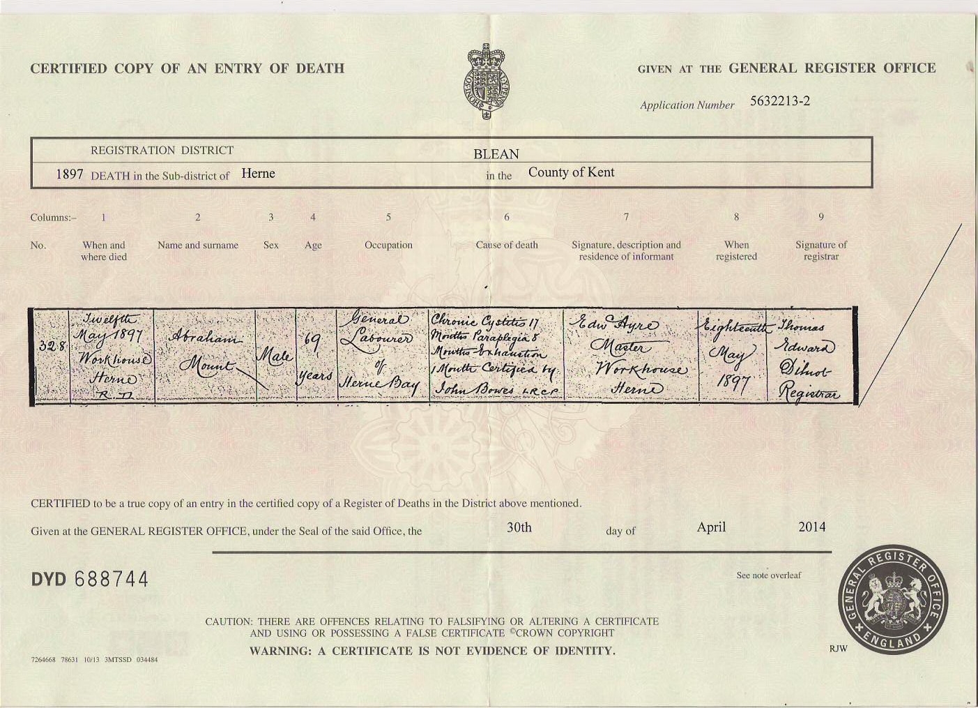 He died on May 12, 1897 Herne Workhouse in Herne4 (chronic cystitis, mortis paraplegia, mortis exhaustion).