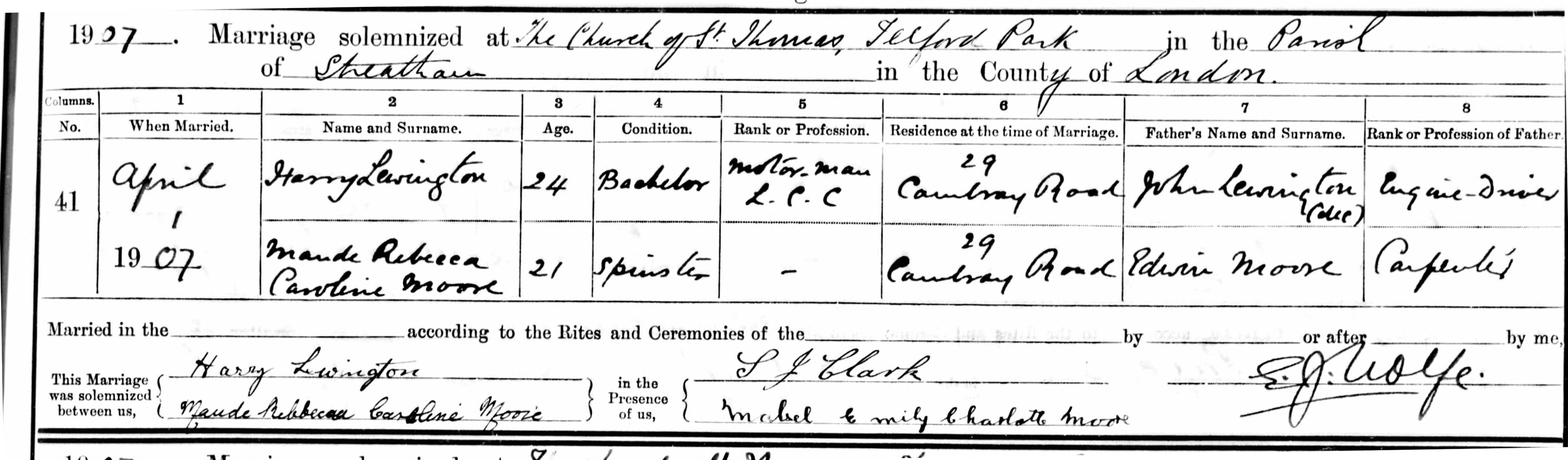 Maude Moore, the second cousin twice-removed on the mother's side of Nigel Horne, was born in Larkfield, Kent, England on Oct 30, 18851,2,3,4,5,6 and baptized in East Malling, Kent, England on Dec 27, 1885. She married Harry Lewington at St Thomas, Telford Park, Streatham, London, England on Apr 1, 19078.