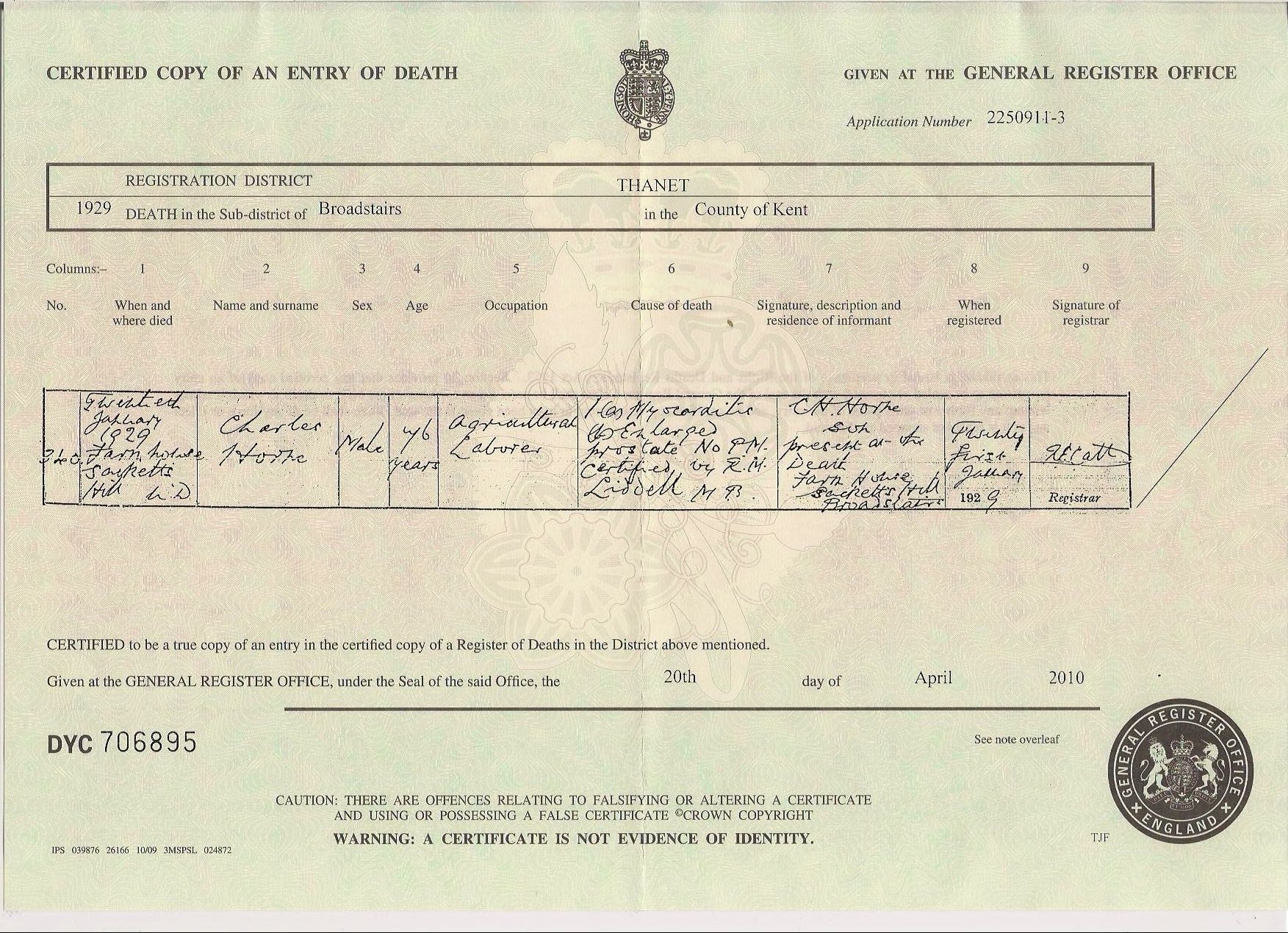 Charles spent all of his life in Kent, England. Throughout his life, he lived in several places around the county: Northdown in Margate on Apr 2, 18711; at Drapers Cottage in Margate on Apr 5, 189110; at 15 Haine Cottages, St Lawrence, Thanet on Mar 31, 190111; on Elder Cottage, 23 Northdown Road, St Peters, Thanet on Apr 2, 191112 (when he was living with his mother, Elizabeth Ann) following the death of his wife on Jun 7, 1909; and at Sacketts Hill Farm, St Peters, Thanet on Jun 19, 192113. Charles In 1921 he was working at George Phippott Farmer on Buddles Farm, Dane Court Road, Broadstairs, Kent, England.