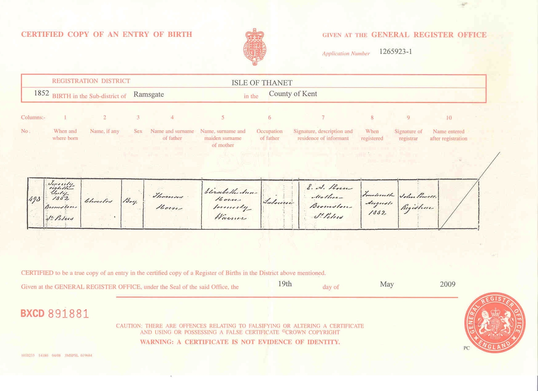 Charles Horne, the great-grandfather of Nigel Horne, was born in St Peters, Thanet, Kent, England on Jul 28, 18521,2,3,4,5,6, was baptized there on Oct 10, 1852 and married Jane Tutt (a laundress with whom he had 3 children: Charles Henry, Isaac and Edmund) at Mount Ephraim Baptist Chapel, Margate, Kent, England on Jun 9, 18839 (Mount Ephraim Chapel).