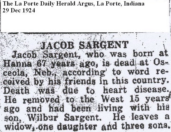 Jacob Sargent, the second cousin four-times-removed on the mother's side of Nigel Horne, was born in Hannah, LaPorte, Indiana, USA on Feb 18, 18561,2 and married Alice Bellmore (with whom he had 5 children: Louisa, Orethia Ella, Charles Jacob, Frank Edward and Wilbur Orllie) in LaPorte, Indiana, USA on Sep 22, 1877.