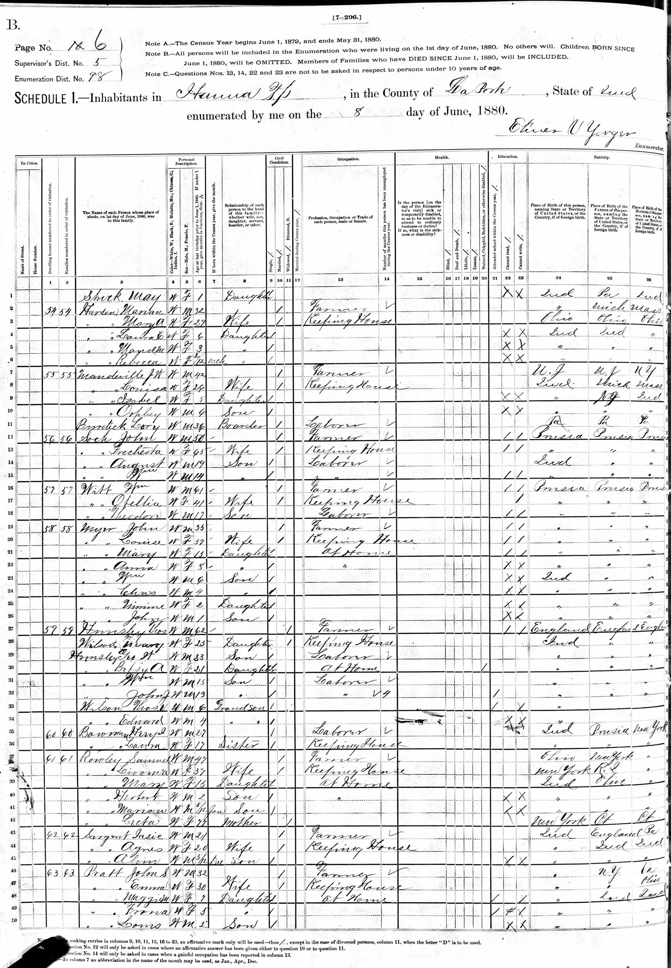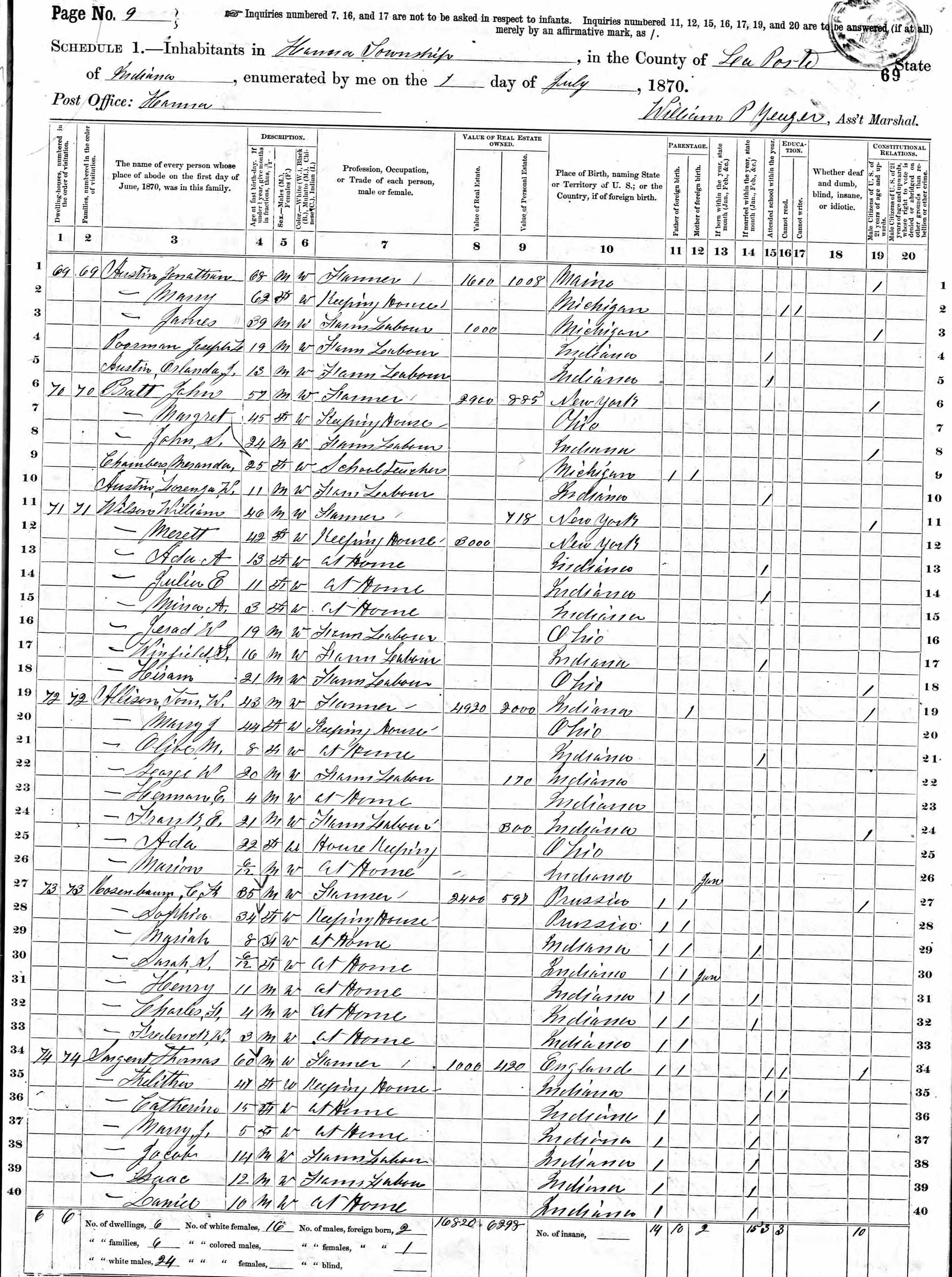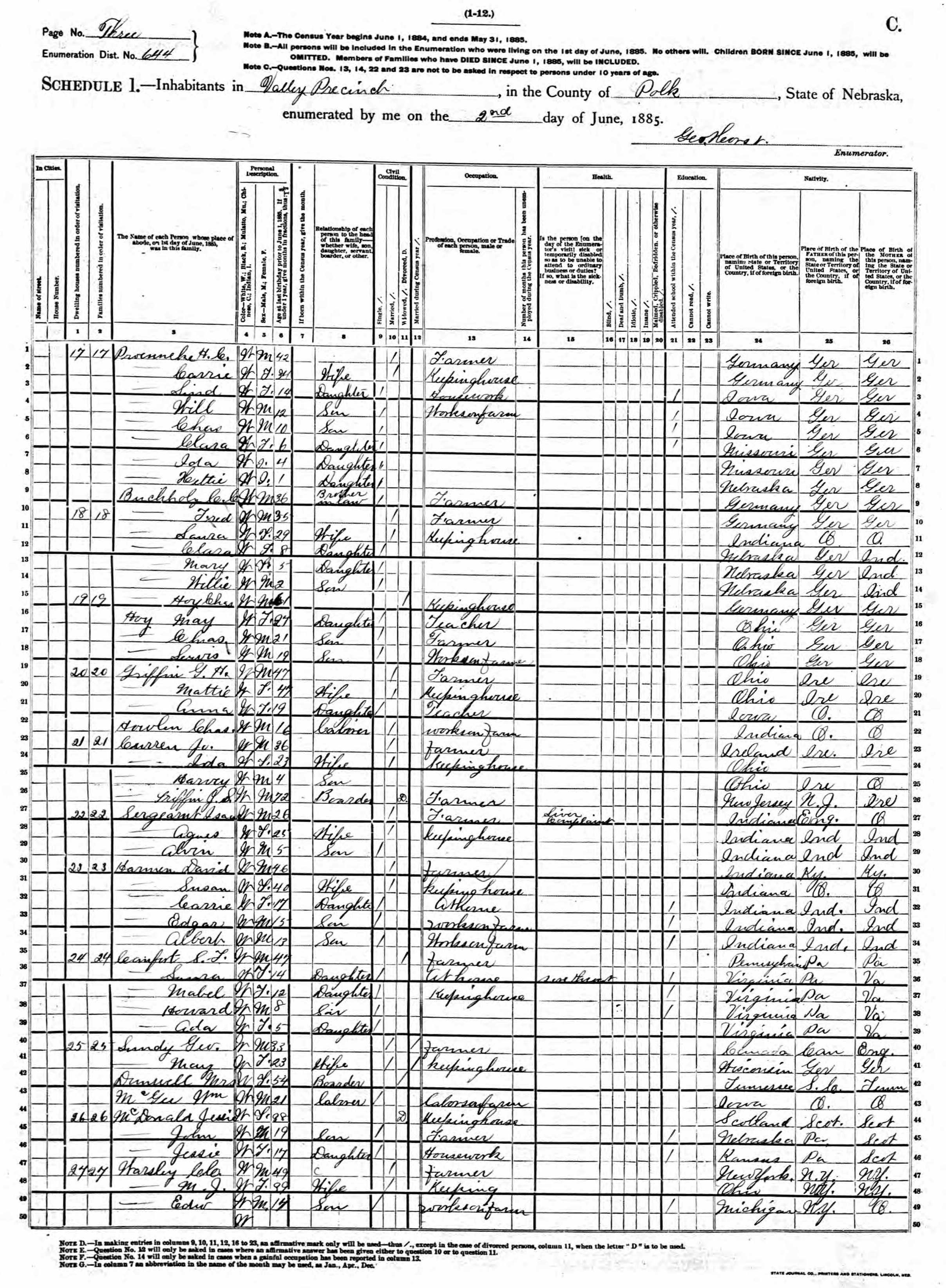 Throughout his life, Isaac lived in several places: in Pleasant, Indiana on Jun 1, 18604; in Hanna, Indiana in 1870 and on Jun 8, 1880; in Valley, Polk, Nebraska on Jun 2, 1885; in Canada, Polk, Nebraska in 1900; in Polk, Nebraska on Jun 1, 19005 following the death of his wife on Jun 29, 1887; and in Osceola, Polk, Nebraska on Apr 15, 19103.