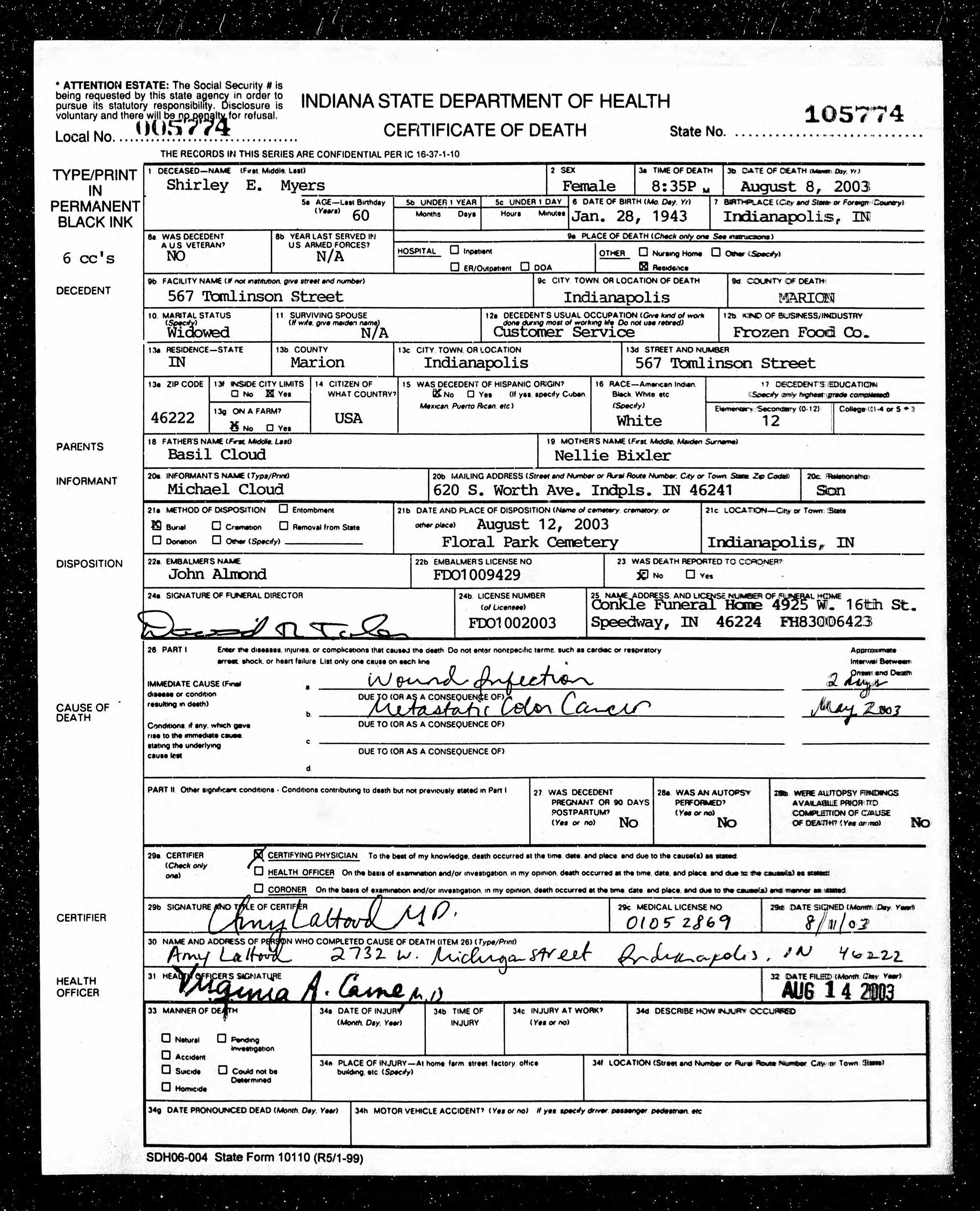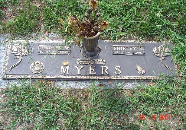 She died on Aug 8, 2003 in Indianapolis2,3 (metastatic colon cancer) (from The Indianapolis Star on Aug. 10, 2003; www.legacy.com; Shirley E. Cloud Myers, 60, Indianapolis, died August 8, 2003. She was in customer service for Midwest Frozen Foods for 20 years, she also worked at Meijer's. Memorial Contributions may be made to the or Vistacare Hospice Foundation. Services will be held at 11:30 a.m. Tue., August 12 at Conkle Funeral Home, Speedway, with calling from 3 to 8 p.m. Mon., August 11. Burial: Floral Park Cemetery. She was preceded in death by her husband Charles Myers. Survivors include her sons,Michael and Douglas Cloud; and her granddaughter Lindsey Cloud) and was buried there at Floral Park Cemetery on Aug 12, 2003.