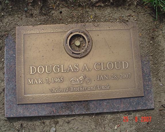 Obituary: "Douglas A. Cloud 41, Indianapolis, passed away January 28, 2007. He worked for Pitney Bowes Government Solutions for five years. Douglas a member of A.B.A.T.E. of Indiana, the N.R.A., and was an avid Harley rider. He was survivedby fiancee, Terri E. Schulmeyer and her daughter, Stephanie Schulmeyer; brother, Michael F. (Julie) Cloud and their daughter, Lindsey Cloud; several aunts, uncles, cousins, and a host of friends.".