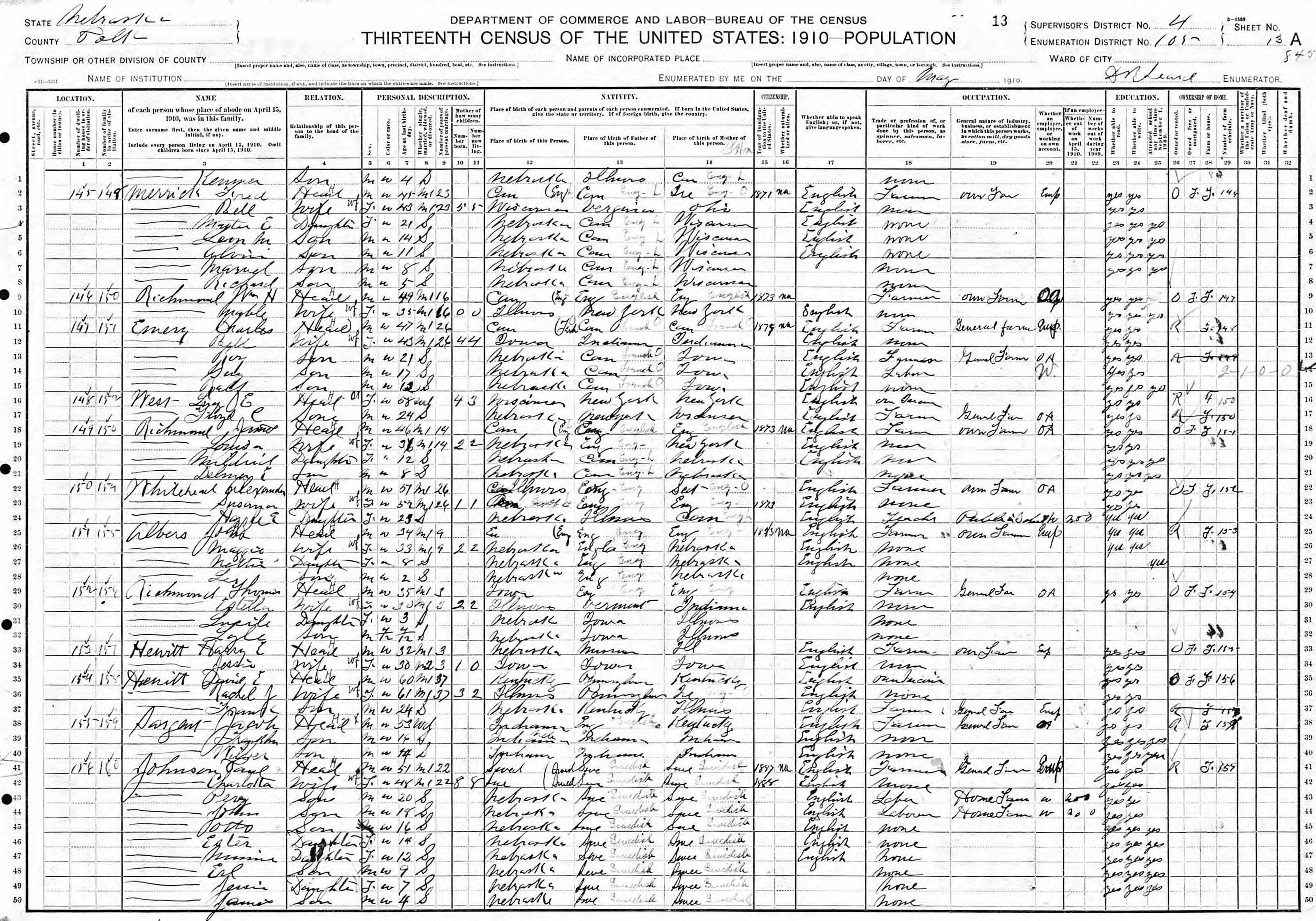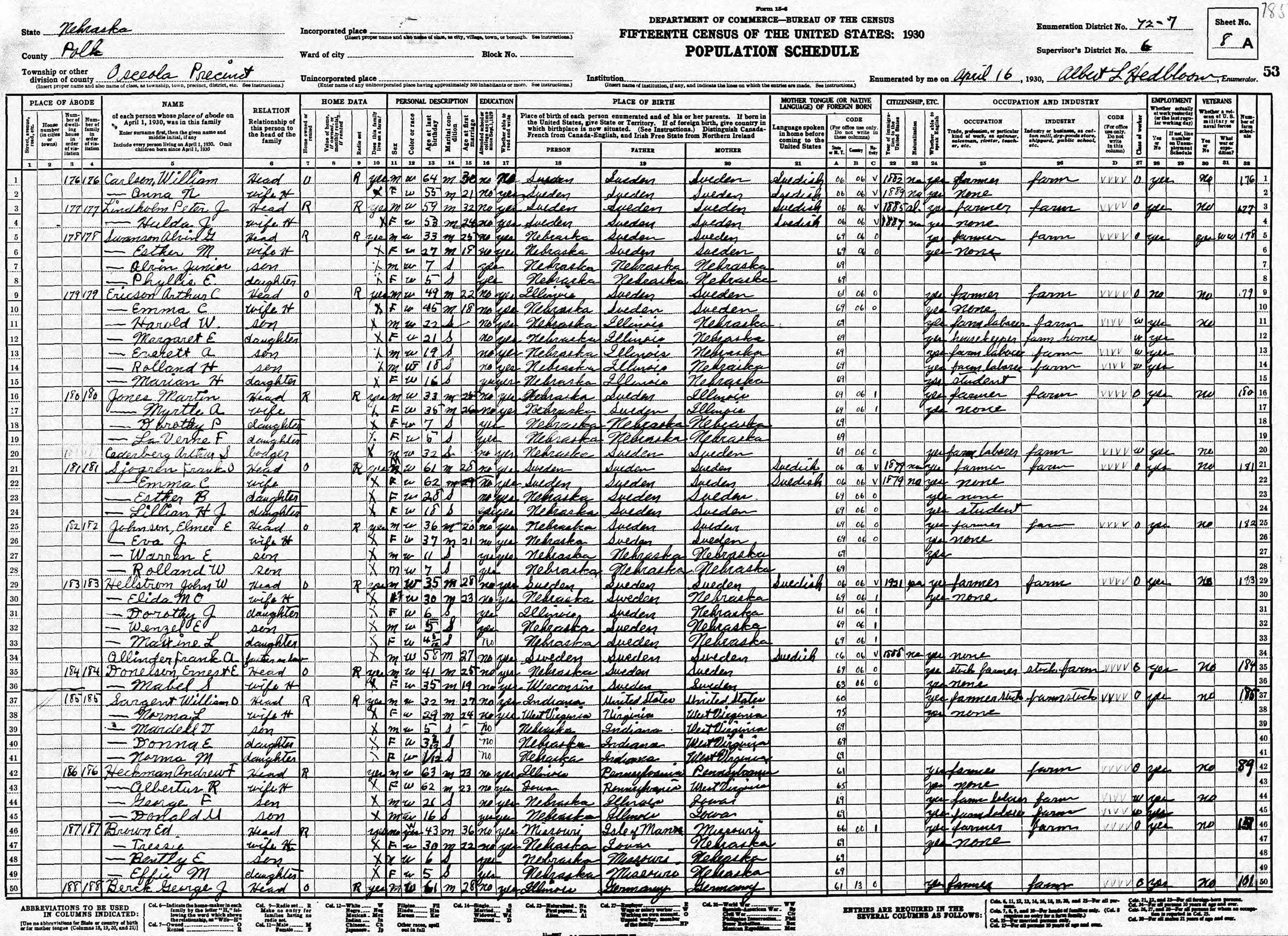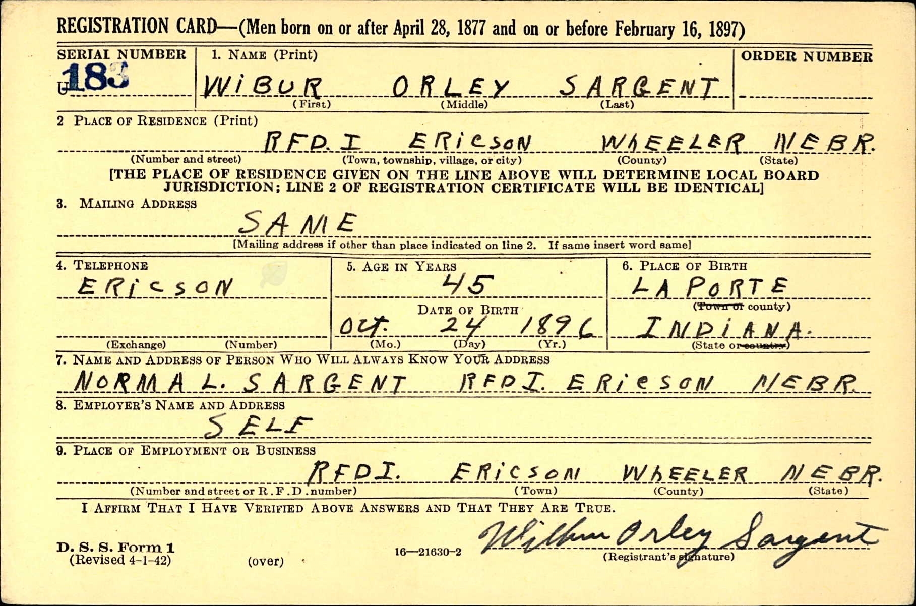 Throughout his life, he lived in Osceola, Polk, Nebraska, USA on Apr 1, 19308; and in Ericson, Wheeler, Nebraska on Apr 1, 19407 and in 1942. He served in the military from 1917 to 1918 (world War I Draft Registration Cards).