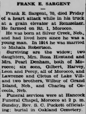 Frank Sargent, the third cousin three-times-removed on the mother's side of Nigel Horne, was born in Silver Creek, Merrick, Nebraska, USA on Jun 8, 18941,2 and married Mahala Robertson (with whom he had 8 children: Rosa, Gilbert Jake, Pearl, Lawrence Leroy, Cletus Edward, Harvey A, Leon Burton and Percy B, along with 3 surviving children) in Kankakee, Illinois, USA on Feb 17, 19143.
