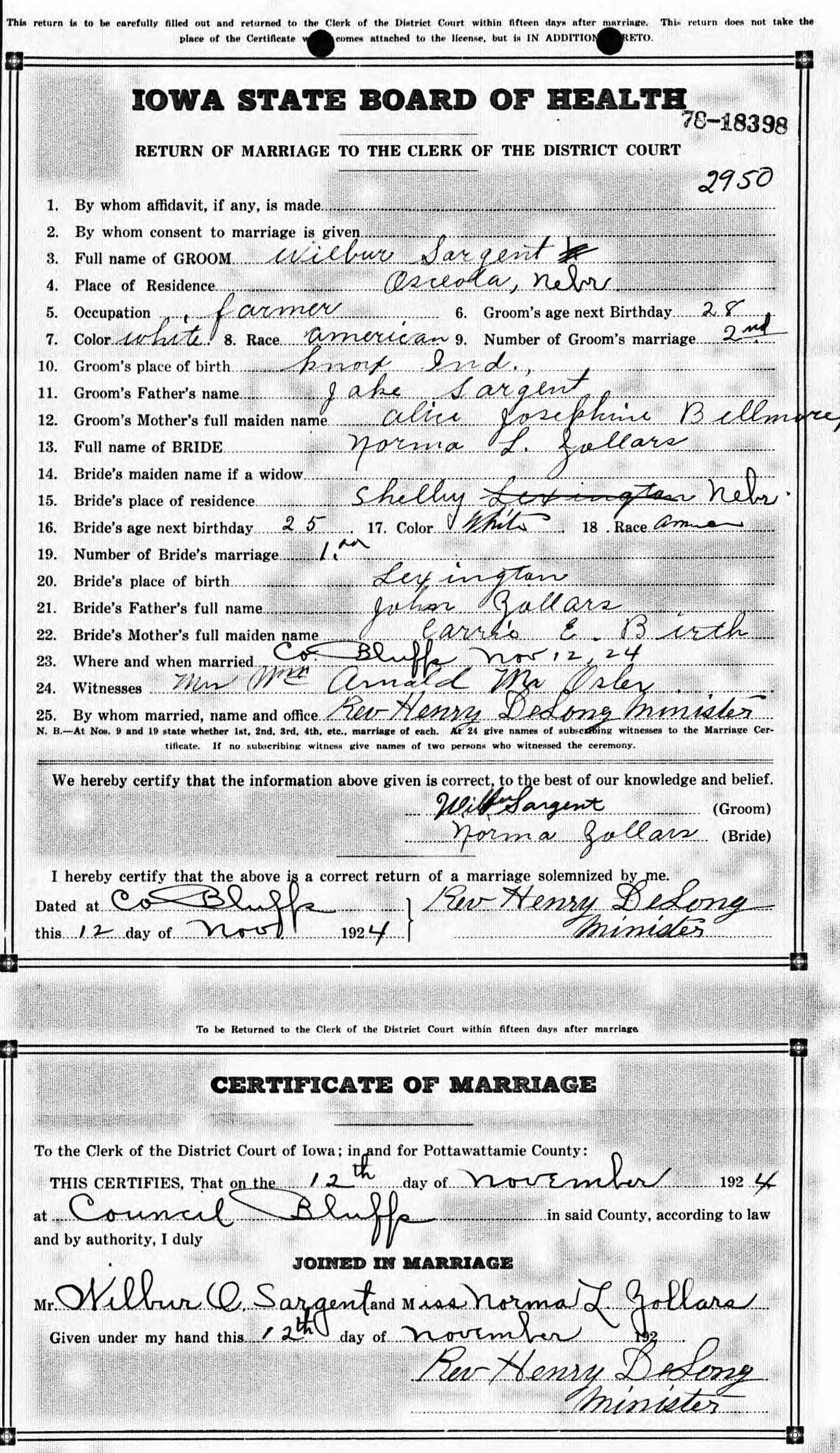 Norma Zollars, the wife of Wilbur Orllie Sargent (the third cousin three-times-removed on the mother's side of Nigel Horne), was born in Lexington, Dawson, Nebraska, USA on May 17, 19001,2 and married Wilbur (a farmer with whom she had 6 children: Mardell DeVern, Donna Elaine, Norma M, Wilfreda, Roberta and Dwayne, along with 2 surviving children) in Council Bluffs, Pottawattamie, Iowa, USA on Nov 12, 19243.