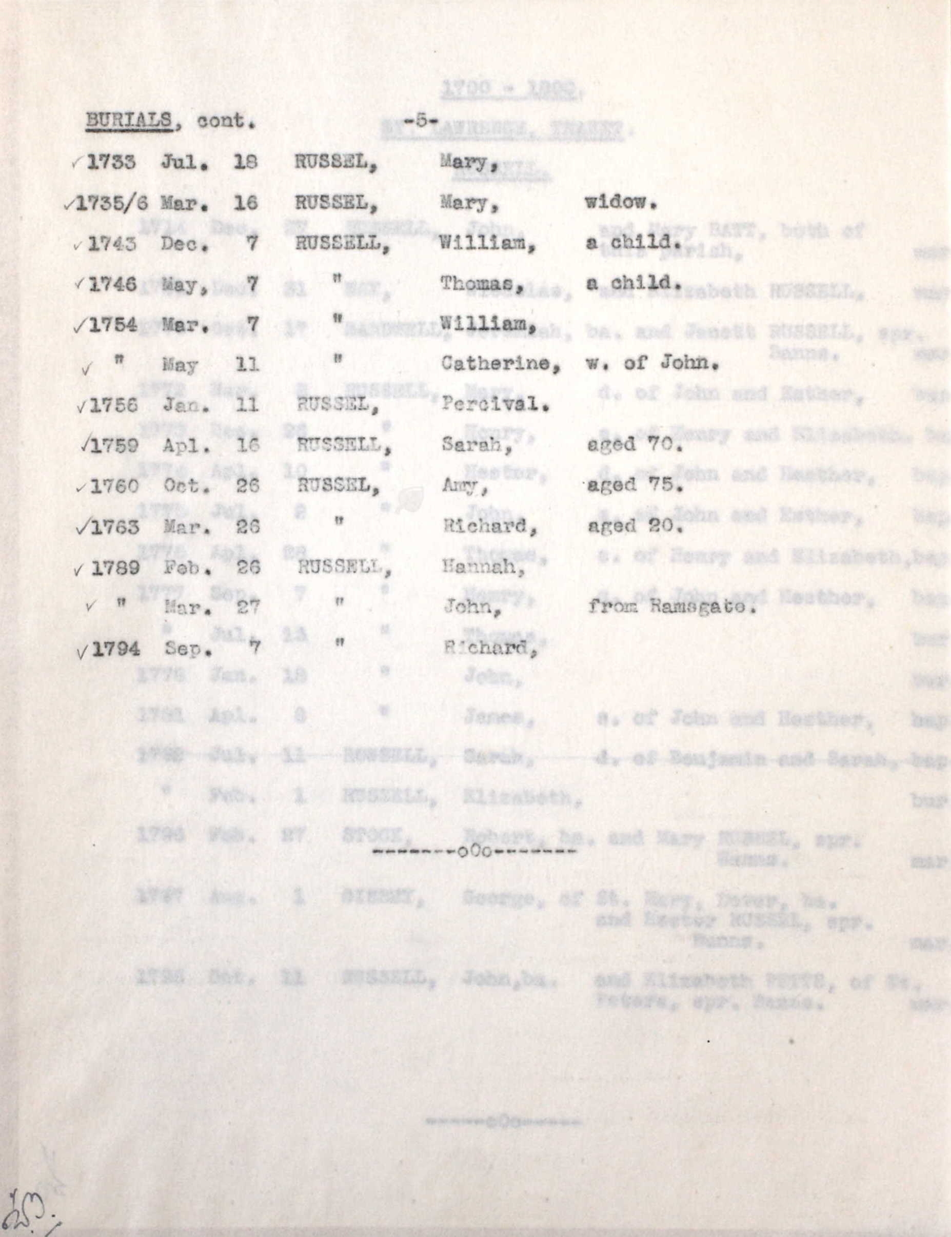William Russel, the husband of Hannah Witherden (the six times great-aunt of Nigel Horne), and married Hannah (with whom he had 8 children: William, John, Hannah, Mary, Martha, William, Anne and Sarah) in St Peters, Thanet, Kent, England on Sep 27, 1742 (KFHS CD29).
