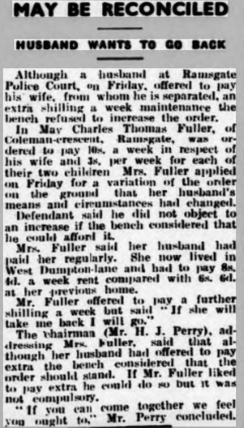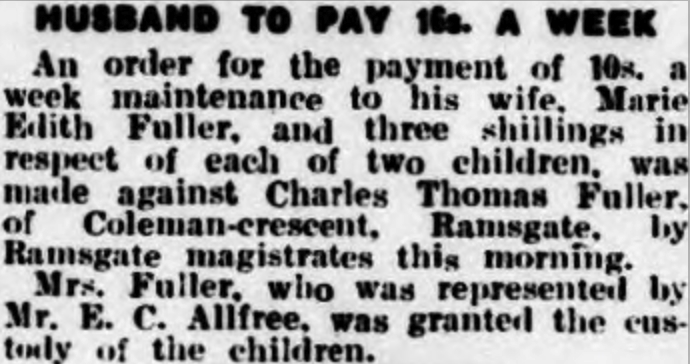Charles Fuller, the second cousin once-removed on the father's side of Nigel Horne, was born in Ramsgate, Kent, England on Jan 7, 19051,2,3 and baptized there at St Luke's Church on Feb 1, 1905. He married Marie Walker in Thanet, Kent, England around Nov 19244. Like his father, he was a general laborer.