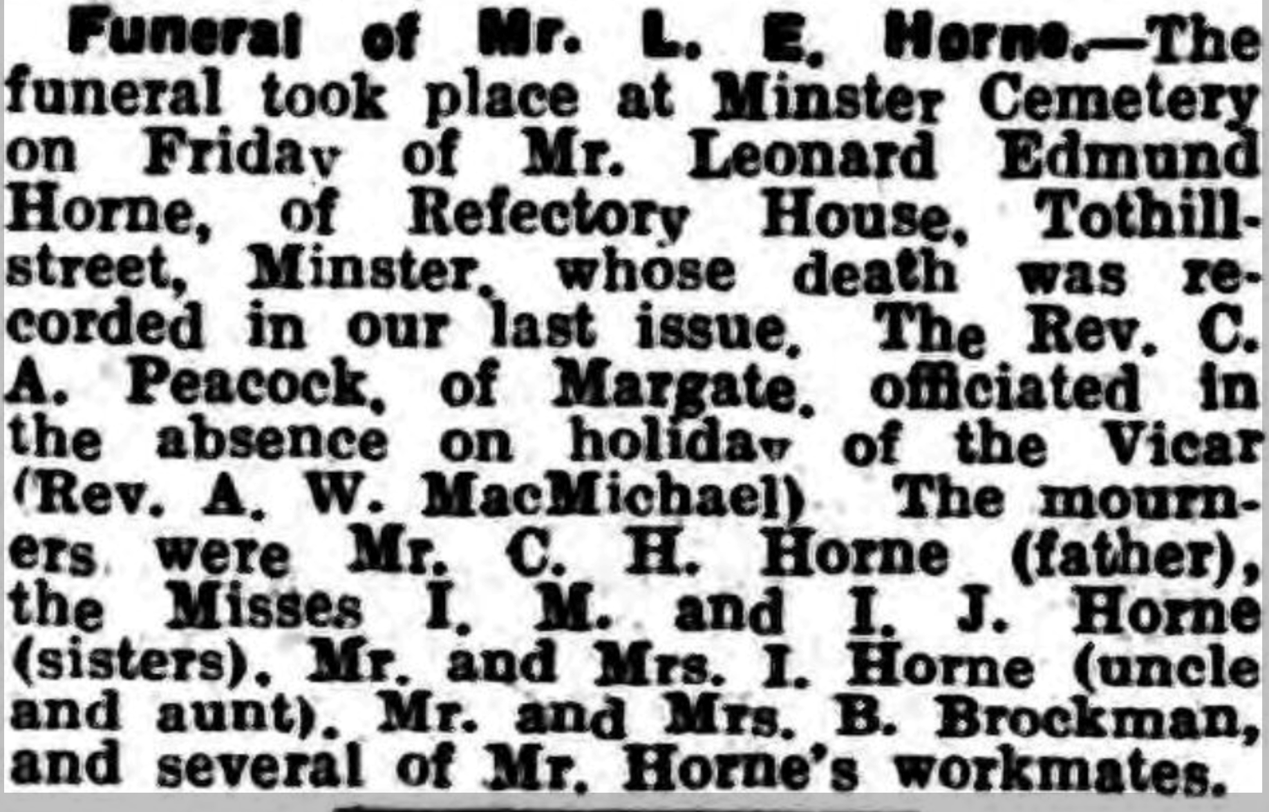 Leonard Horne, the first cousin once-removed on the father's side of Nigel Horne, was born in St Peters, Thanet, Kent, England on Jun 5, 19121,2.