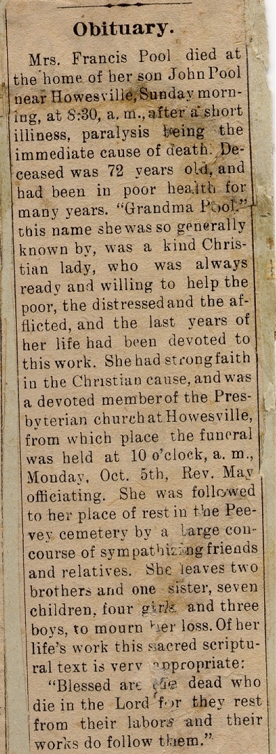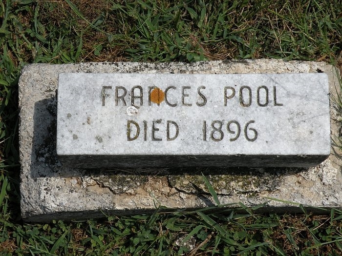 Family stories are that Frances Elizabeth Sergeant and John Edward Pool were both from Kent, England, but did not know each other while there. They both sailed on the Wellington from London, England and that's where they met. They arrived in New York on May 18, 1841 and were married on February 5, 1842 in Allen County, Indiana. They moved from there to Clay County, Indiana in 1859, where they owned 80 acres in Howesville. John helped charter the Presbyterian Church in Howesville.