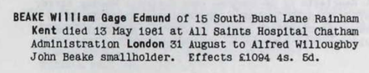 He died on May 13, 1961 at All Saints Hospital, Chatham, Kent4.