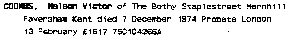 Nelson Coombs, the second cousin twice-removed on the mother's side of Nigel Horne, was born in Seasalter, Kent, England on Oct 6, 18941,2 and baptized in Hernhill, Kent, England on Nov 11, 1894. He married Hilda Packman at Christ Church, Dunkirk, Kent, England on Nov 11, 19223. Like his father, he was an agricultural laborer.