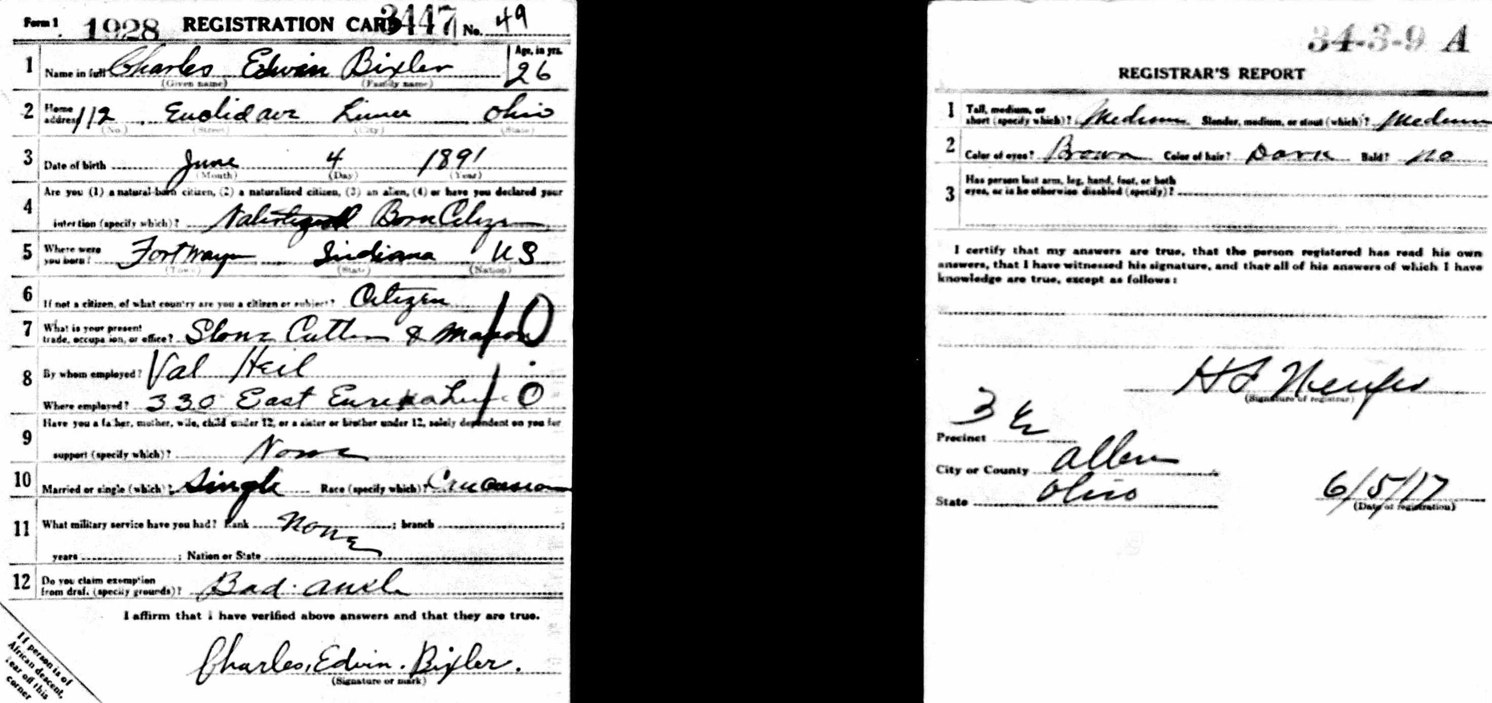 Throughout his life, Charles lived in several places: at his birthplace on Jun 9, 1900; at 112 Euclid Avenue, Lima, Allen, Ohio, USA on Jun 5, 1917; in Lima, Ohio on Jan 10, 19206; at 121 McIver Street, Greensboro, Guilford, North Carolina, USA in 1929; on Wilson Street, Greensboro, North Carolina on Apr 3, 1930; and at 253 S Pine Street, Lima, Ohio on Apr 16, 19405 and in 1942. He served in the military from 1917 to 1918 (pvt. 4127243).