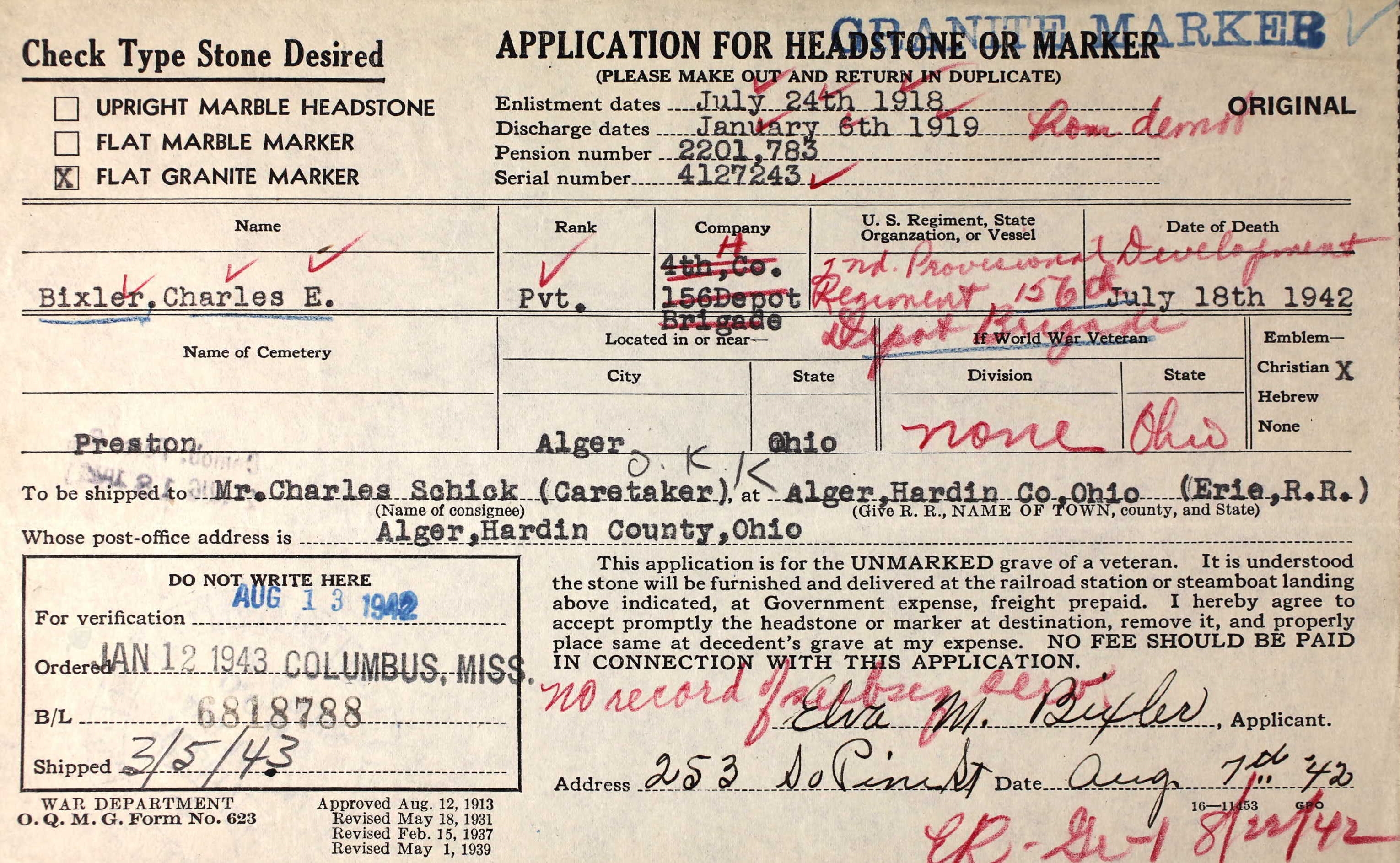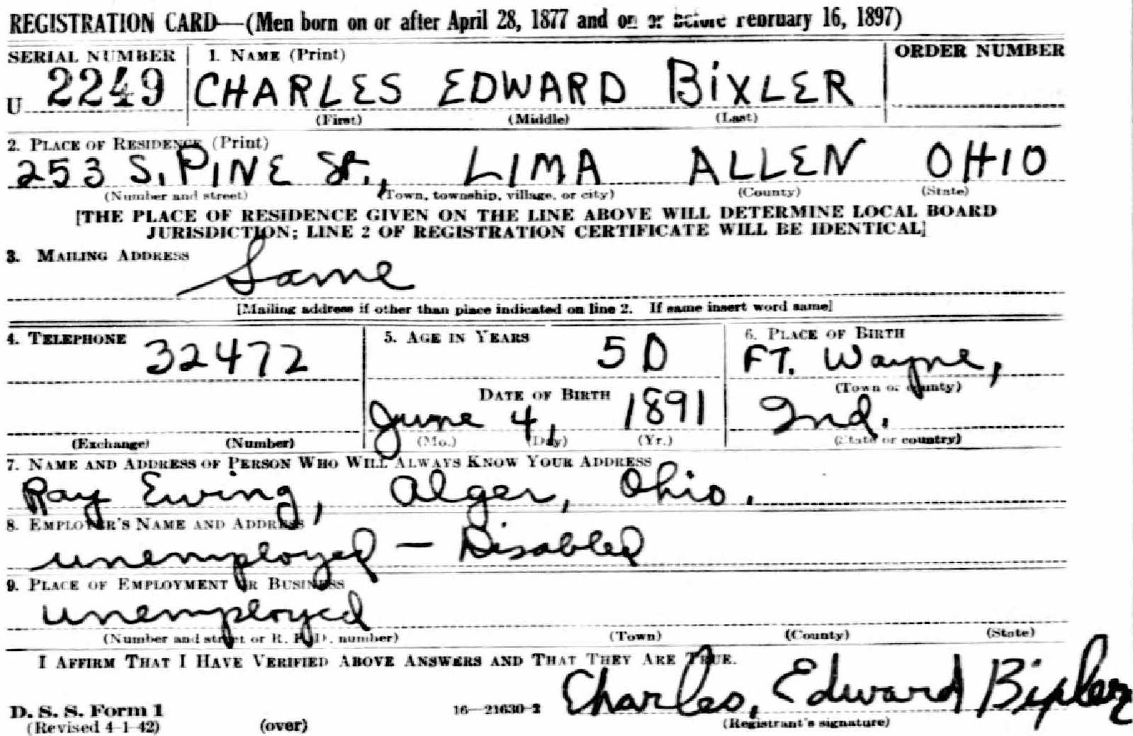 He died on Jul 18, 1942 in Lima, Ohio2,3,4 (from The Lima News, Saturday, July 18, 1942: Charles E. Bixler, 54, a World war veteran, died Saturday morning at his home, 253 S. Pine-st, after a long illness. He was a native of Ft. Wayne, Ind., and had lived in Lima for about 30 years. He was a stonecutter by trade. Surviving are his wife, Elva; his father and mother, William and Anna Bixler of Wolcottville, Ind. and two brothers, Harry and Jesse, both of Ft. Wayne. He was a member of Trinity Methodist church and the Brotherhood Sunday school class. Funeral services will be held at the late home Monday at 10 a.m., in charge of Rev. W. B. Arthur of Alger. Burial will be in Alger cemetery) and was buried at Preston Cemetery, Alger, Hardin, Ohio after Jul 18, 1942.