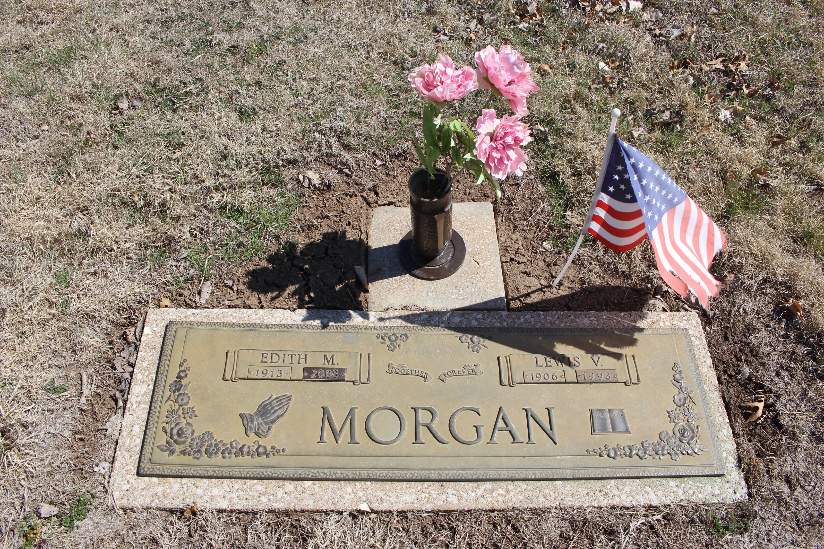 She died on May 8, 2008 in Salina, Saline, Kansas, USA1 (from www.tributes.com Edith M. Morgan, 95, Salina, died Thursday, May 8, 2008. She was born Edith M. Sargent on April 12, 1913, in Polk County, Neb., to Charles and Nellie (Thompson) Sargent. She was a homemaker. She enjoyed gardening, flowers and family. She was preceded in death by her husband, Vilorious Lewis, in 1993; a son, Max in 2006; mother-in-law, Lura Morgan, in 1965; and a brother, Lee, in 1983. Survivors include her daughter-in-law, Barbara of Salina; three grandsons, Randall and wife Deidra of Salina, Duane "Cap" and wife Brenda of Ellsworth and Chris of Salina; six great-grandchildren; and four sisters, Helen Johnson and Betty Rech of York, Neb., Opal Ladbury of Salem, Ore., and Irene Riley of Montrose, Colo. Graveside service will be at 3 p.m. Monday, May 12, 2008, in Roselawn Memorial Park Cemetery, Salina. Memorials: Windsor Estates Nursing Center, Salina) and was buried there after May 8, 2008.