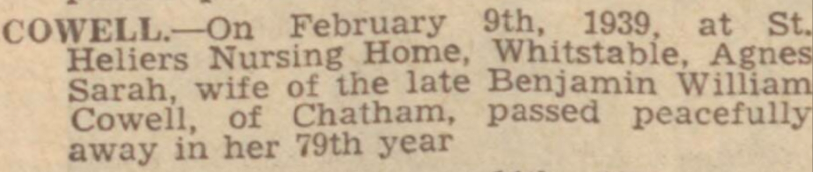 [ Home ] | [ Calendar ] | [ Surnames Index ] | [ Family History ]Agnes Jacobs, the wife of Benjamin William Cowell (the second cousin three-times-removed on the mother's side of Nigel Horne), was born in Ventnor, Isle Of Wight, England in 18601 and married Benjamin (a woolen warehouse foreman with whom she had 5 children: Ernest Benjamin, Albert William, Minnie Gertrude, Grace Edith and Stanley George) in Medway, Kent, England around May 18812.
