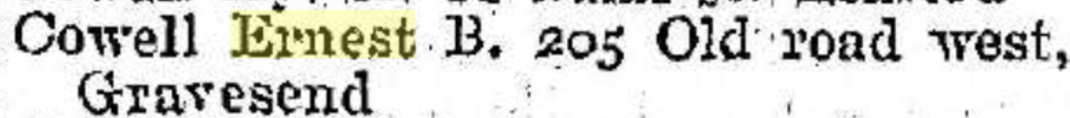 Ernest Cowell, the third cousin twice-removed on the mother's side of Nigel Horne, was born in Chatham, Kent, England on Jul 9, 18831,2,3,4,5 and was married twice - to Ethel Steddy (in 1907 in Medway, Kent, England) Mabel Heath (c. May 1939 in Strood, Kent, following the death of Ethel Maud c. Nov 1937)7. He had 1 child with Ethel Steddy, Ernest Frederick William.