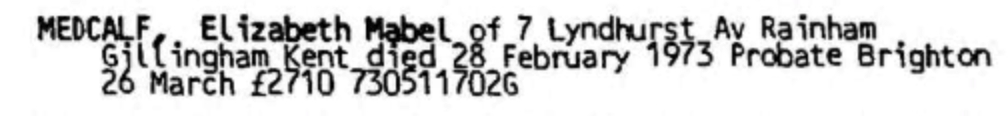 Elizabeth Cowell, the third cousin twice-removed on the mother's side of Nigel Horne, was born in Rochester, Kent, England on Apr 13, 18901,2,3,4,5, was baptized there at St Margaret's Church on Jun 15, 1890 and married Lewis Medcalf (a house decorator with whom she had 1 child, Mary Helen) in Medway, Kent, England around May 19206.