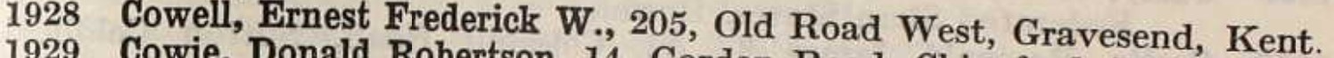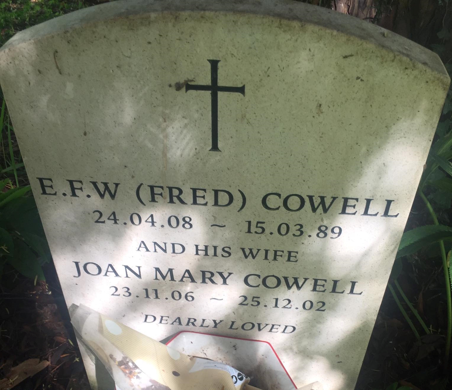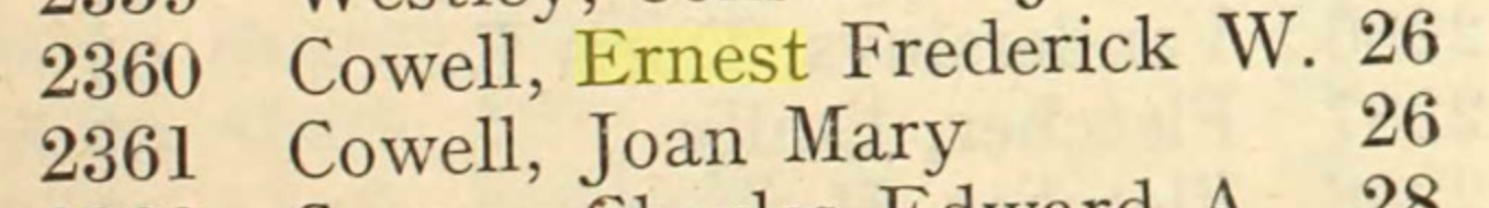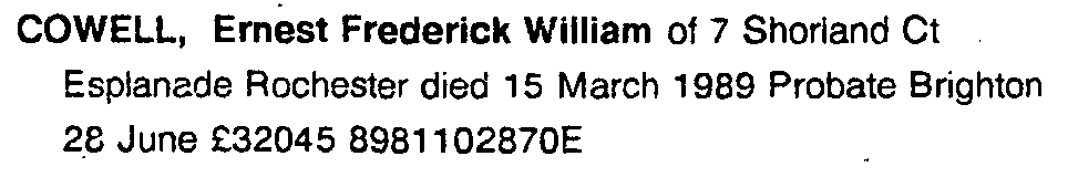 Ernest Cowell, the fourth cousin once-removed on the mother's side of Nigel Horne, was born in Medway, Kent, England on Apr 24, 19081,2,3 and married Joan Bennett (an index clerk with whom he had 3 children: Roger Housden, Clive D and Hilary M, along with 2 surviving children) at All Saints, Perry Street, Northfleet, Kent, England on Aug 26, 19334.