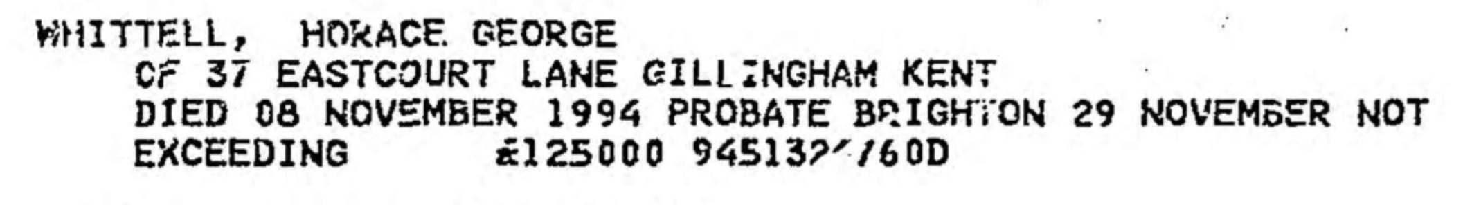 Horace Whittell, the fourth cousin once-removed on the mother's side of Nigel Horne, was born in Medway, Kent, England on Oct 11, 19141,2. He married Gladys Willey in Medway around Nov 19394.
