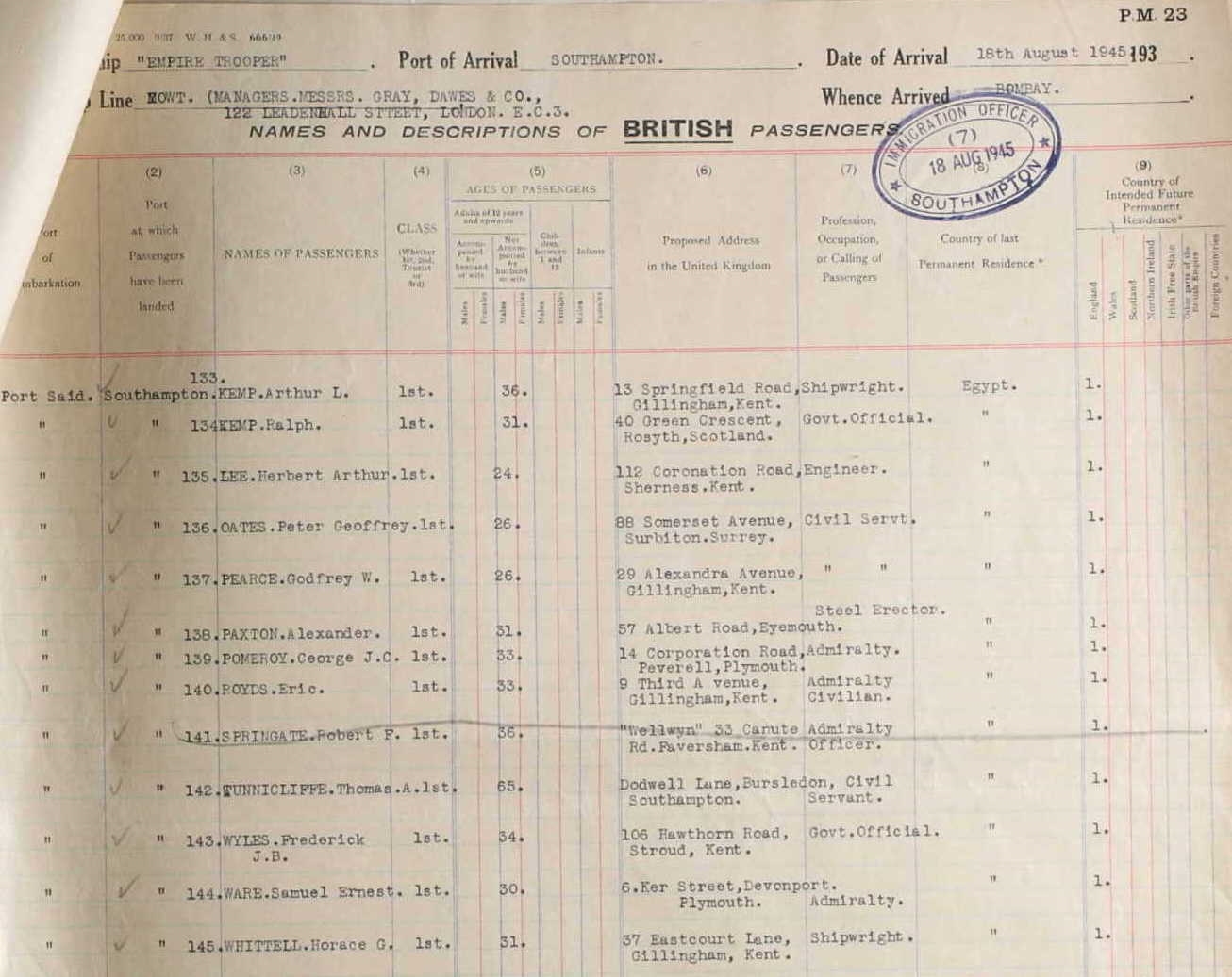 Throughout his life, he lived on 116 Victoria Road, Chatham, Kent, England on Sep 29, 19395; and at 37 Eastcourt Lane, Gillingham, Kent on Aug 18, 1945 and in 1994. On Aug 18, 1945 he arrived in Southampton, Hampshire, England.He traveled from Port Said, Ash Sharqiyah, Egypt in 1945 (on the ship "Empire Trooper".).