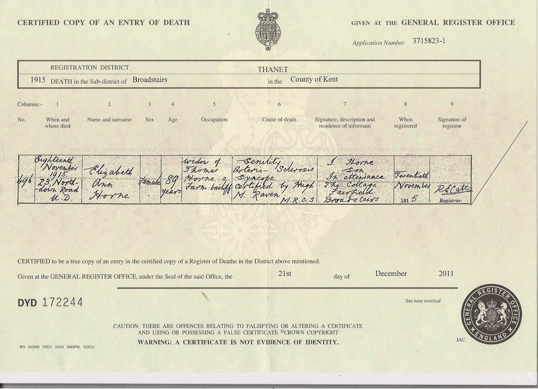 She died on Nov 18, 1915 on 23 Northdown Road, St Peters, Thanet, Kent6 (senility, arterio-sclerosis, syncope) and was buried at St Peters Churchyard, St Peters on Nov 24, 1915.