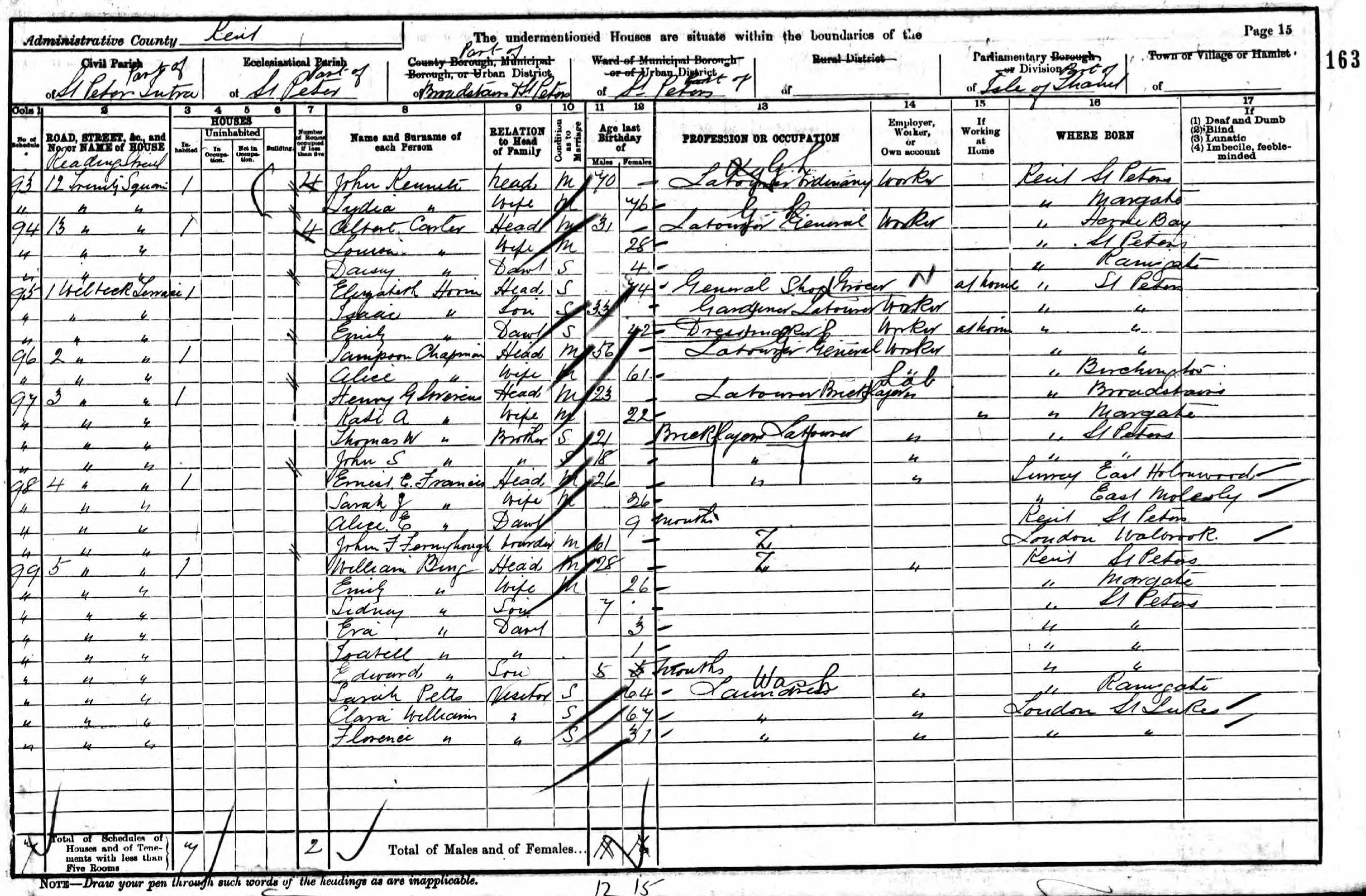 Elizabeth spent all of her life in Kent, England. Throughout her life, she lived in several places around the county: at her birthplace on Jun 6, 1841; at Bromstone, St Peters, Thanet on Mar 30, 185111 and on Apr 7, 1861; at Northdown in Margate on Apr 2, 18718; on Buddles Farm, Dane Court Road, St Peters, Thanet on Apr 3, 188112; at 194 Reading Street, St Peters, Thanet on Apr 5, 18919; at 1 Welbeck Terrace, Reading Street, St Peters, Thanet on Mar 31, 19015 following the death of her husband on Feb 26, 1901; and on Elder Cottage, 23 Northdown Road, St Peters, Thanet on Apr 2, 191110.