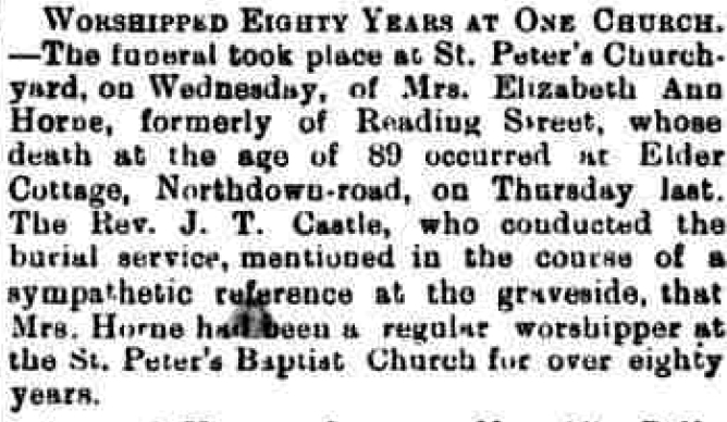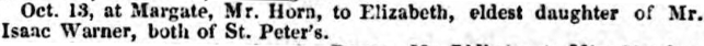 Elizabeth Warner, the great-great-grandmother of Nigel Horne, was born in St Peters, Thanet, Kent, England on Sep 29, 18261,2,3,4,5,6, was baptized there on Oct 29, 1826 and married Thomas Horn (a farm bailiff with whom she had 9 children: Elizabeth Alice, Charles, Thomas Warner, Caroline, Emily, Hannah, Harry, Isaac and Ellen Mary Ann) at St John the Baptist Church, Margate, Kent, England on Oct 13, 18497.