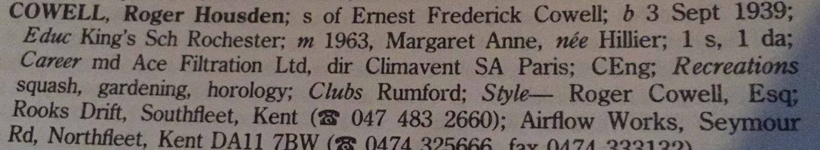 Roger Cowell, the fifth cousin on the mother's side of Nigel Horne, was born in Bromley, Kent, England on Sep 3, 19391,2 and. He went to King's School, Rochester, Kent, England He married Margaret Hillier (with whom he had 2 surviving children Rex Jonathan and Anita Janine) in Dartford, Kent around May 19633.