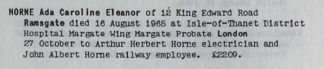 Ada spent all of her life in Kent, England. Throughout her life, she lived in several places around the county: at James Street in Ramsgate on Apr 5, 18918; on Alpha Road in Ramsgate on Mar 31, 19011; on 30 Royal Road in Ramsgate on Apr 2, 1911; and on 12 King Edward Road in Ramsgate on Jun 19, 19212, on Mar 6, 1926, on Sep 29, 19393 and in 1965.