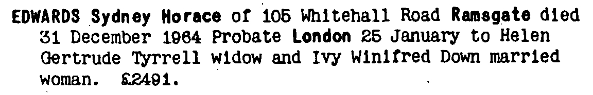 Sydney spent all of his life in Kent, England. Throughout his life, he lived in several places around the county: in West Dumpton, Thanet, Kent, England on Apr 5, 18918; at Waterworks Cottage, St Lawrence in Thanet on Mar 31, 19017; on Waterworks House, Southwood Road, St Lawrence in Thanet on Apr 2, 19116; at Southwood Road, St Lawrence, St Lawrence Intra in Thanet in 19215; on 90 Southwood Road, St Lawrence in Thanet on Jun 19, 19219 (when he was living with his parents); and on 105 Whitehall Road, Ramsgate on Sep 29, 19391, when he was living with his sister, Helen Gertrude, in 19554 and in 1964. Sydney In 1921 he was working at Own Account Blind Chair Caner.