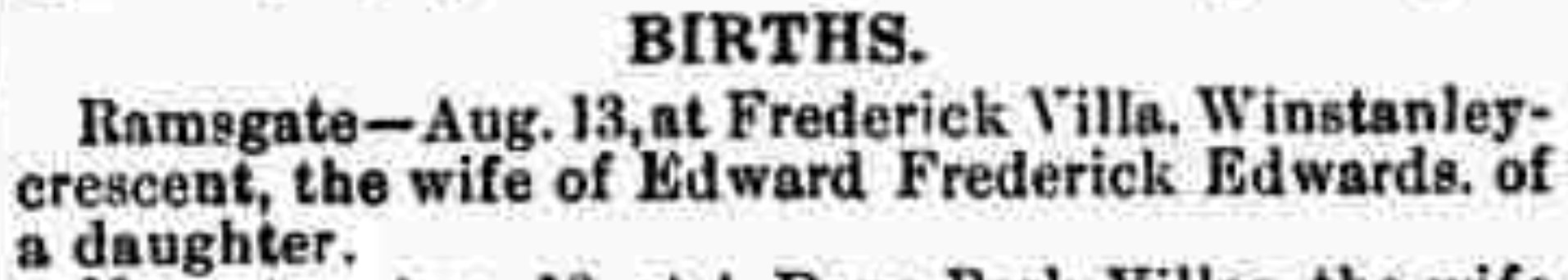 Elsie Edwards, the second cousin twice-removed on the mother's side of Nigel Horne, was born in Ramsgate, Kent, England on Aug 13, 19031,2,3,4 and married Thomas Miles (with whom she had 1 child, David Peter) in Thanet, Kent, England around Aug 19285.
