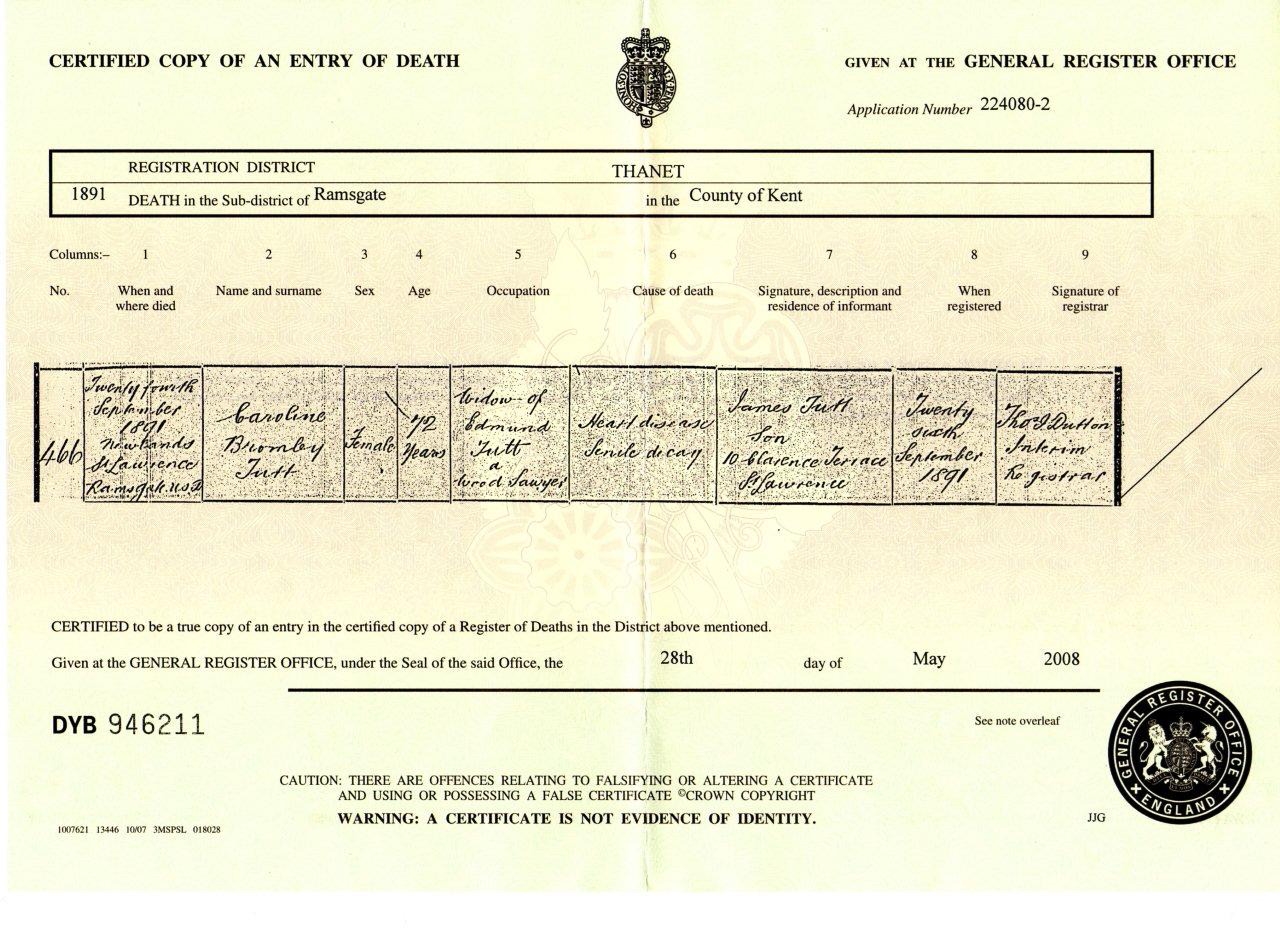 She died on Sep 24, 1891 at Newlands, St Lawrence, Thanet, Kent5,7 (heart disease and senile decay) and was buried there on Sep 28, 18917,9.
