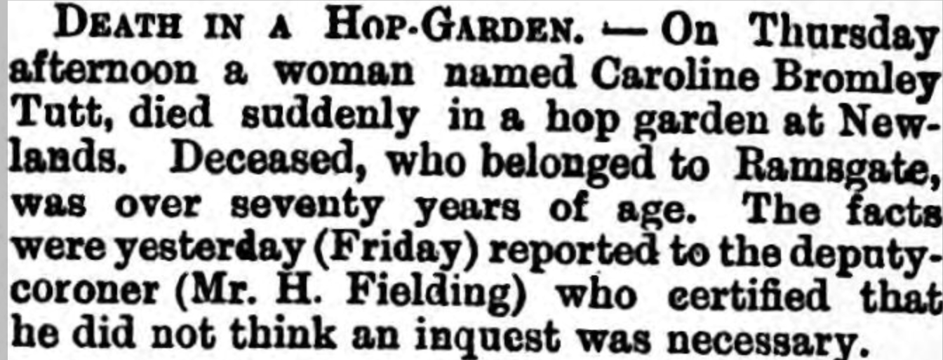 Throughout her life, Caroline lived in several places: at 40 George Street, Buckland, Kent on Mar 30, 185112; at 13 Shooter's Hill, Buckland, Kent on Apr 7, 186110, when she was living with her daughter Jane following the death of her husband on Dec 21, 1858; and at 18 Clarence Terrace, St Lawrence, Thanet, Kent on Apr 3, 188111.